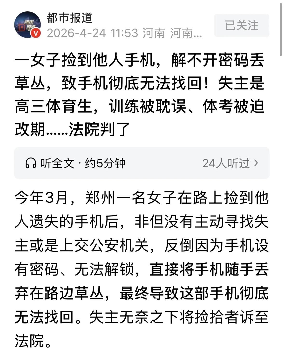 “手机发烫怕爆炸才扔的!”郑州女子捡到高三体育生手机,解不开密码随手扔进草丛,导致体考被迫改期,被告上法庭索赔9000元,法院判了 郑州一名女子在路边捡到一部手机,因解不开密码便随手扔进草丛,不料失主是一名高三体育生,手机里存有重要的训练计划和体考报名资料。手机丢失后,该生训练受阻、体考被迫改期。失主将女子告上法庭索赔9000元。庭审中,女子改口称“手机发烫怕爆炸才扔的”,但法院未予采信。法院依据《民法典》第316条关于拾得人妥善保管义务的规定,判决女子赔偿6000元。 一、一部手机,差点断送一个体育生的前途 事情发生在去年7月。 郑州的高三体育生小杰(化名),妈妈花7700块钱给他买了部新手机。这孩子平时训练、查体考报名信息、看训练计划,全都靠这部手机,里面存的东西对他来说是“命根子”。 今年3月的一个晚上,小杰骑车的时候,手机不小心从身上滑落掉在了路上。等他反应过来再打自己的电话,已经关机了。 孩子急得团团转,赶紧报了警。 民警调了沿路的监控,很快就锁定了目标——一个叫元某的女子,在路边捡起了那部手机。 二、“解不开密码,随手就扔了” 民警联系上元某的时候,她倒也没赖账,直接承认自己确实捡了一部手机。 但她接下来说的话,让小杰和家长彻底急了。 元某说:手机有密码,我试了半天解不开,觉得留着也没用,就随手扔路边草丛里了。 更让人崩溃的是,她扔手机的那个位置,刚好是监控死角。民警带着人找了半天,连手机的影子都没见到。 一部7700块的手机,就这么彻底丢了。 可小杰损失的远远不止一部手机。 他是高三体育生,手机里存着详细的训练计划、体考报名的重要资料。手机一丢,训练没法正常进行,体考时间也被迫改了期,压力一下子大了好几倍。 孩子和家长跟元某协商了好几次,希望她能承担一点责任。元某那边一直不松口。 没办法,小杰的家人直接把元某告上了法院,要求她赔偿手机损失和间接损失,一共9000块钱。 三、法庭上改口:“手机发烫我怕爆炸” 开庭的时候,元某的说法来了个180度大转弯。 她一开始压根儿没提手机有什么问题。后来法官警告她,如果虚假陈述要承担法律责任,她才改了口,说捡到手机的时候发现手机发烫、电池鼓包,怕爆炸才扔掉的。 但这个说法,一没有证据,二跟她自己当初对民警说的话完全对不上号。 当时民警问她,她清清楚楚说的是“解不开密码,觉得没用就扔了”。从头到尾没提过“发烫”“鼓包”“怕爆炸”这几个字。 法官当然不可能信她。 四、法律分析:捡到的东西,不是你想扔就能扔 很多人有个误区,觉得东西是我捡的,又不是偷的抢的,我想怎么处理就怎么处理。 法律可不这么认为。 《民法典》第316条写得明明白白:拾得人在遗失物送交有关部门前,应当妥善保管遗失物。因故意或者重大过失致使遗失物毁损、灭失的,应当承担民事责任。 翻译成人话就是:你捡到别人的东西,要么想办法联系失主还回去,要么交到派出所或者相关管理部门。在还回去或者交上去之前,你有义务好好保管这个东西。 如果你故意把它弄坏、弄丢、随便扔掉,造成了损失,你得赔。 这个案子里,元某因为解不开密码就把手机扔进草丛,导致手机彻底找不回来,这属于典型的“故意”导致物品灭失。赔钱,是跑不掉的。 那赔多少呢? 手机已经找不到了,没法做价值鉴定。法院按照电子产品最低3年折旧的标准算了一下:这部手机7700元买的,已经用了8个月,折算下来大概值6000块钱。 最后法院判决:元某赔偿小杰6000元。 至于小杰提出的因为体考改期、训练受阻造成的其他损失,法院没有支持,因为这部分损失金额不太好具体量化。 五、写在最后:捡到东西,请记住这三步 这件事在网上传开后,不少网友都在讨论。 有人说:“一部手机差点毁了一个孩子的体考,这个责任她担得起吗?” 也有人说:“法院判6000已经算公道了,毕竟手机本身是有折旧的。” 其实这个案子给所有人都提了个醒:捡到东西,正确的做法只有三步—— 第一步,想办法联系失主。 手机没密码就直接打回去,有密码就等着失主打电话来。 第二步,如果联系不上,就近交到派出所或者商场服务台、地铁工作人员手里。 第三步,千万不要觉得“我捡的我就有处置权”。 扔掉、卖掉、自己留着用,全都违法。 回过头看元某说的话,“手机发烫怕爆炸”,这个理由听起来是不是有点耳熟?很多时候,人都是在被告上法庭之后,才想起来找借口。 可法律看的是证据,不是谁编的故事更动人。 最后想问大家:如果你丢了存有重要资料的手机,被捡到的人随手扔了,你能接受6000块的赔偿吗?你觉得体考改期造成的损失该不该也赔一点? 欢迎在评论区说说你的看法。 来源: 据河南当地法院及多家媒体报道综合整理