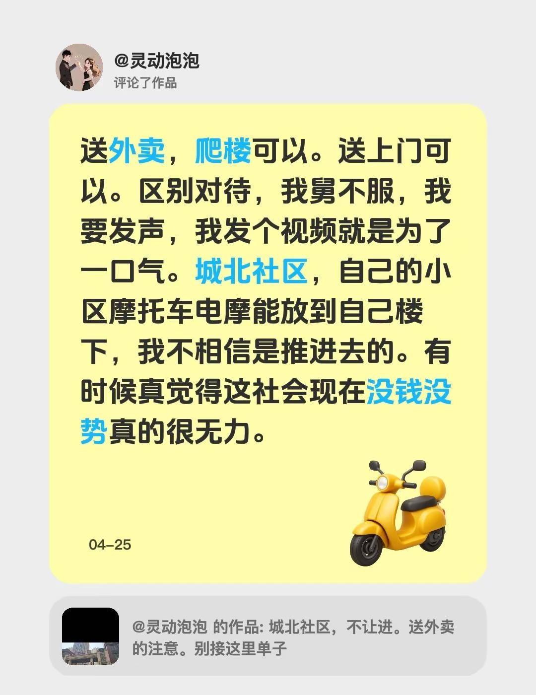 我评论了@灵动泡泡 的作品:送外卖,爬楼可以。送上门可以。区别对待,我舅不服,我要发声,我发个视频就是为了一口气。城北社区,自己的小区摩托车电摩能放到自己楼下,我不相信是推进去的。有时候真觉得这社会现在没钱没势真的很无力。