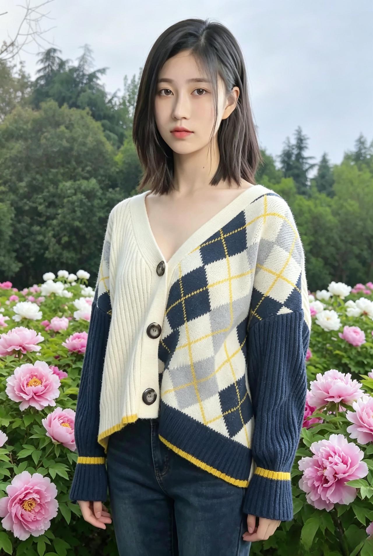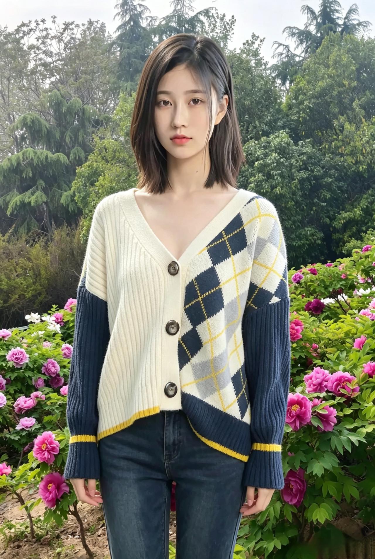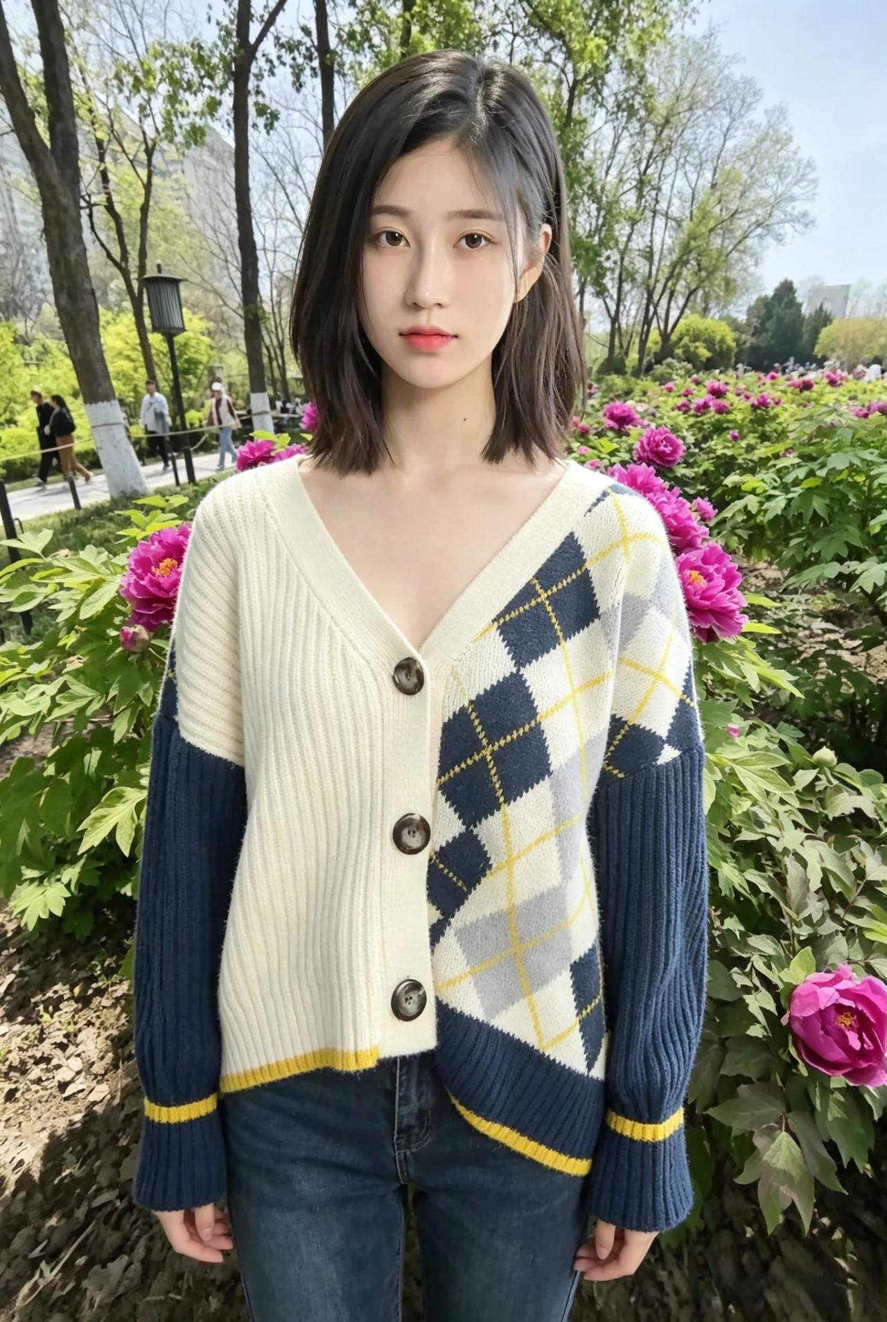 针织衫的纹理裹着温柔 红花开成身后的热烈 短发利落,眉眼清澈 是花间独有的清雅 把春日的鲜活 都揉进了温柔的气质里