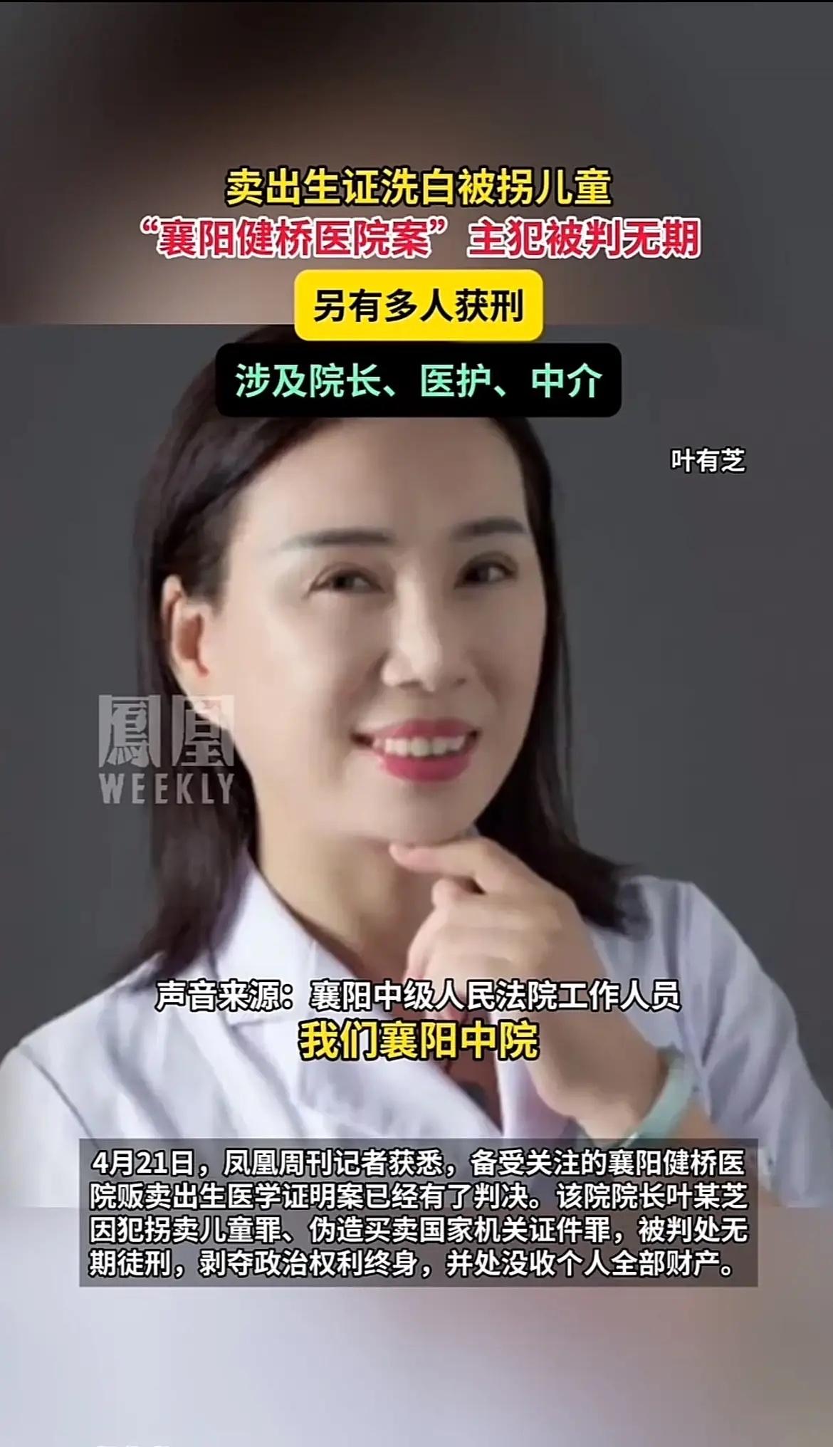 拐卖儿童的主犯,终于判了! 襄阳的叶某芝,本是医院负责人,却跟网络中介勾在一起。被拐来的孩子,七天之内,一套完整的出生证明、住院分娩记录,全给伪造得干干净净。一单十万,她自己拿走六万六,剩下的,团伙再分。 2026年4月21日,襄阳中院正式通报了这起案件的判决结果。叶某芝因拐卖儿童罪、伪造买卖国家机关证件罪两罪并罚,被判处无期徒刑,剥夺政治权利终身,没收个人全部财产。整个案件共有40余人获刑,包括多名参与造假的医护人员和各地的网络中介,目前还有3起相关案件正在二审程序中。 很多人不知道,这不是叶某芝第一次触犯法律。早在2010年,她就因为非法进行胎儿性别鉴定和选择性终止妊娠手术,被判处拘役5个月,还交了1万元罚金。当时她在悔过书里写,自己一时糊涂,有损白衣天使的形象,请求保留医师资格。可谁也没想到,服刑结束后她不仅重回医疗行业,还一步步当上了健桥医院的院长,成了占股80%的大股东。 手里有了医院的管理权,她的胆子越来越大。她把医院的妇产科变成了专门的造假车间。买证的人只要提供父母的身份信息,交9.6万元,医院就会按照正常流程,在系统里录入假的建档、产检、住院记录。所谓的“分娩”根本不需要人到场,医院会找刚生完孩子的其他产妇,用她们的婴儿足底血顶替采样。出院证明、疫苗接种本上的所有信息都是真实可查的,扫码就能验证,普通人根本看不出破绽。 她自己也清楚这件事的严重性。私下里跟团伙成员说,咱们干的是死罪的事,嘴一定要严。她规定所有交易只能用现金或者加密转账,不留任何书面痕迹。每做成一单,她先抽走66%的利润,剩下的再分给下面的医生、护士和中介。靠着这种方式,她在短短几年里赚了几百万,涉及全国十多个省份。 最让人愤怒的是,她不仅给被拐的孩子办假证,还直接参与贩卖婴儿。遇到来医院堕胎的孕妇,她会劝人家把孩子生下来,给几千块钱补偿。孩子生下来之后,她就联系买家,以十几万的价格卖掉。有时候甚至会欺骗产妇,说孩子生下来就夭折了,转头就把孩子卖给别人。 这件事能被曝光,全靠打拐志愿者上官正义长达一年多的暗访。2023年11月,他把收集到的所有证据公之于众,立刻引发了全国的关注。警方迅速成立专案组,查封了涉事医院,控制了所有相关人员。经过两年多的深入调查,终于把这个庞大的犯罪团伙连根拔起。 判决结果出来后,无数网友拍手称快。大家都说,这种利用职务之便伤害孩子的人,判无期都算轻的。也有很多人提到那些被拐孩子的亲生父母,他们可能找了孩子十几年,甚至几十年,却不知道自己的孩子早就有了一个全新的身份,在另一个家庭里过着完全不同的生活。 这件事也给所有人敲响了警钟。出生证明是孩子的人生第一证,它的严肃性不容任何人践踏。医院本是救死扶伤的地方,绝不能成为犯罪分子的保护伞。只有堵住监管的漏洞,才能从源头上切断这种黑色产业链,保护每一个孩子的安全。 各位读者你们怎么看?欢迎在评论区讨论。