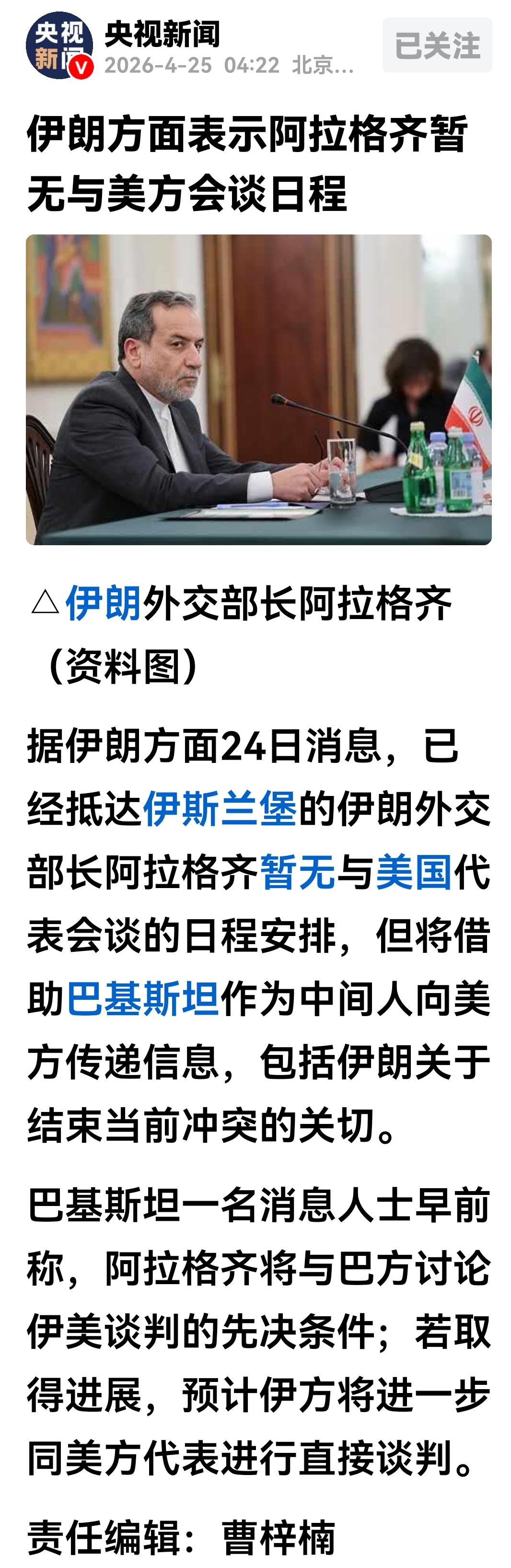 别误会,伊外长阿拉格齐出访巴基斯坦并不是伊朗同意了与美国的谈判。 现在的消息是阿拉格齐出访巴基斯坦,他先要与巴方进行会谈,提出伊朗同意谈判的先决条件,然后由巴方将伊朗的条件传递给美方,若美方同意伊朗的先决条件,伊朗才可能正式走向谈判桌。 综合前面的一些消息,伊朗最重要的先决条件就是要求美方先解除对伊朗的海上封锁,伊朗才会同意与美方进行第二轮谈判,而且这一先决条件巴基斯坦已经传达给了美方,特朗普的第一反应表示会考虑,既没有同意,也没有否决,但是从美军方的消息中得知,美军实际上已经加大了对伊朗的封锁,没有美国的允许,霍尔木兹海峡的所有船只均出不了中东地区。 伊外长阿拉格齐去巴基斯坦,这仅仅证明伊朗并没有关闭谈判大门,现在就看美方的和谈诚意了,若美国封锁伊朗,极限施压只会适得其反!