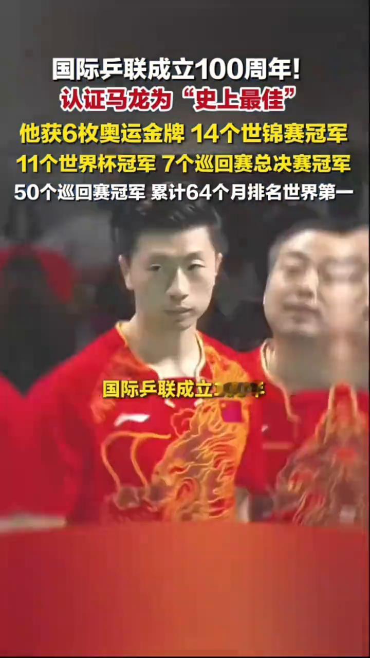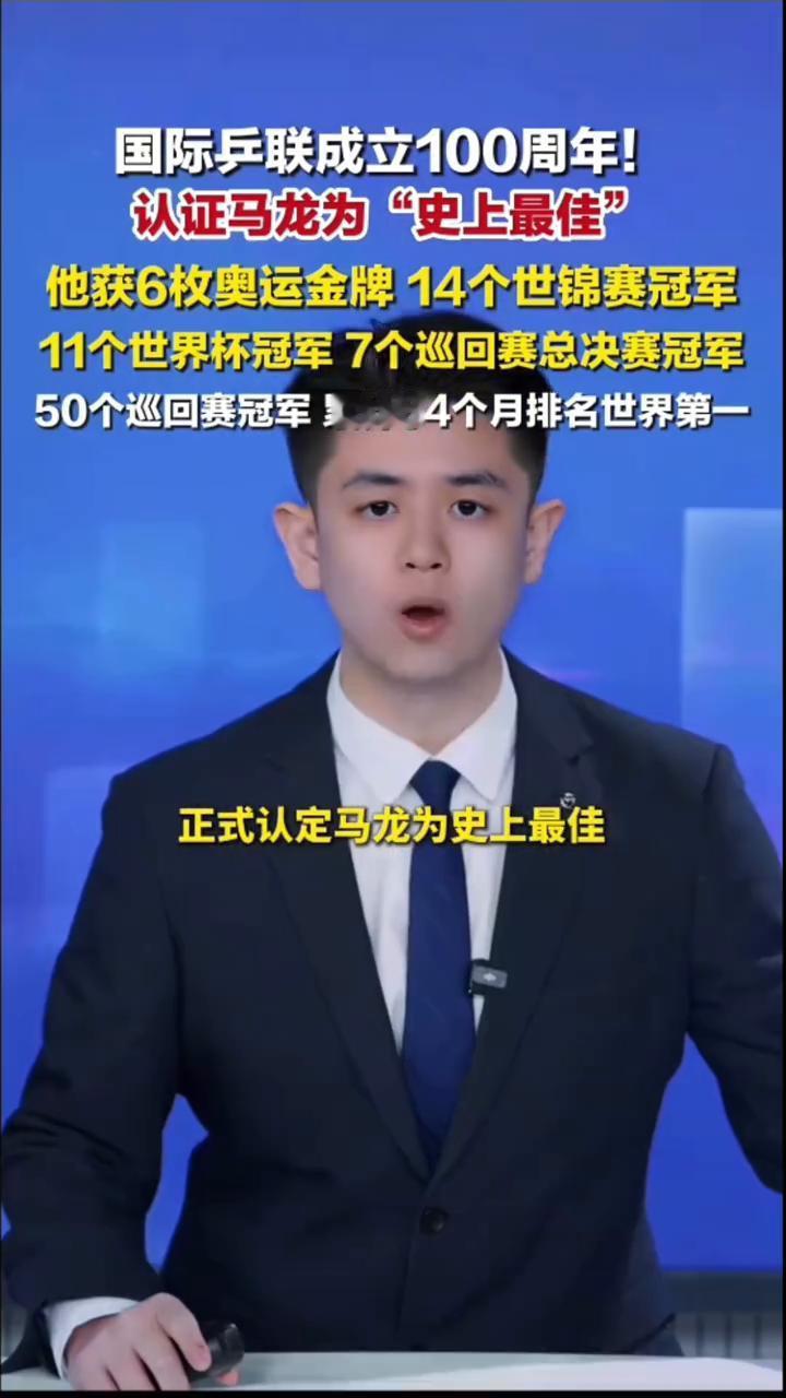 国际乒联成立100周年,认证马龙为"史上最佳"。 马龙获官方认证"乒乓GOAT",国际乒联成立100周年,百年纪录片《谁是乒乓GOAT》上线。综合奥运会、世锦赛、世界杯、巡回赛及世界排名第一时长等因素,正式认定马龙为史上最佳。其核心战绩为:6枚奥运金牌、14个世锦赛冠军、11个世界杯冠军、7个巡回赛总决赛冠军。