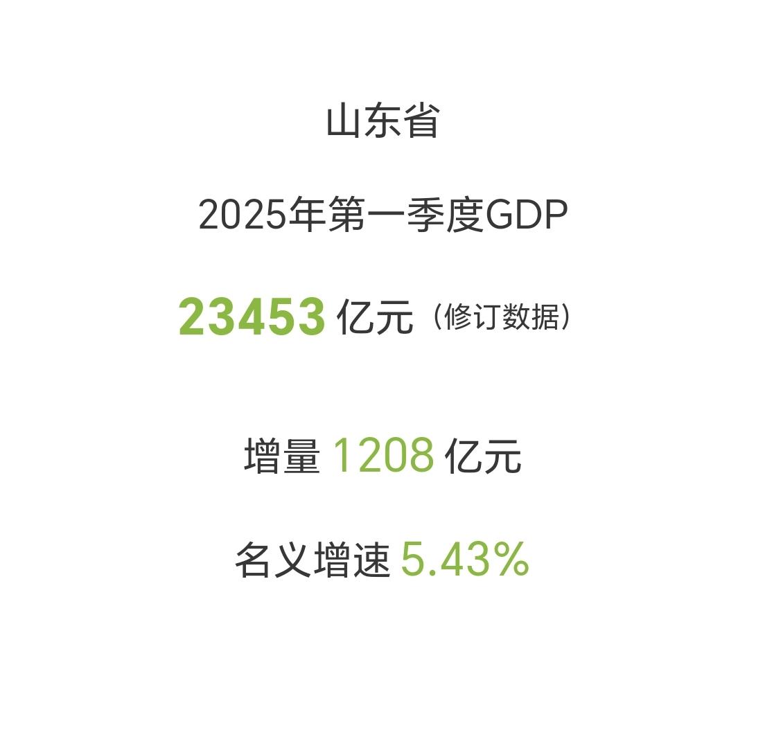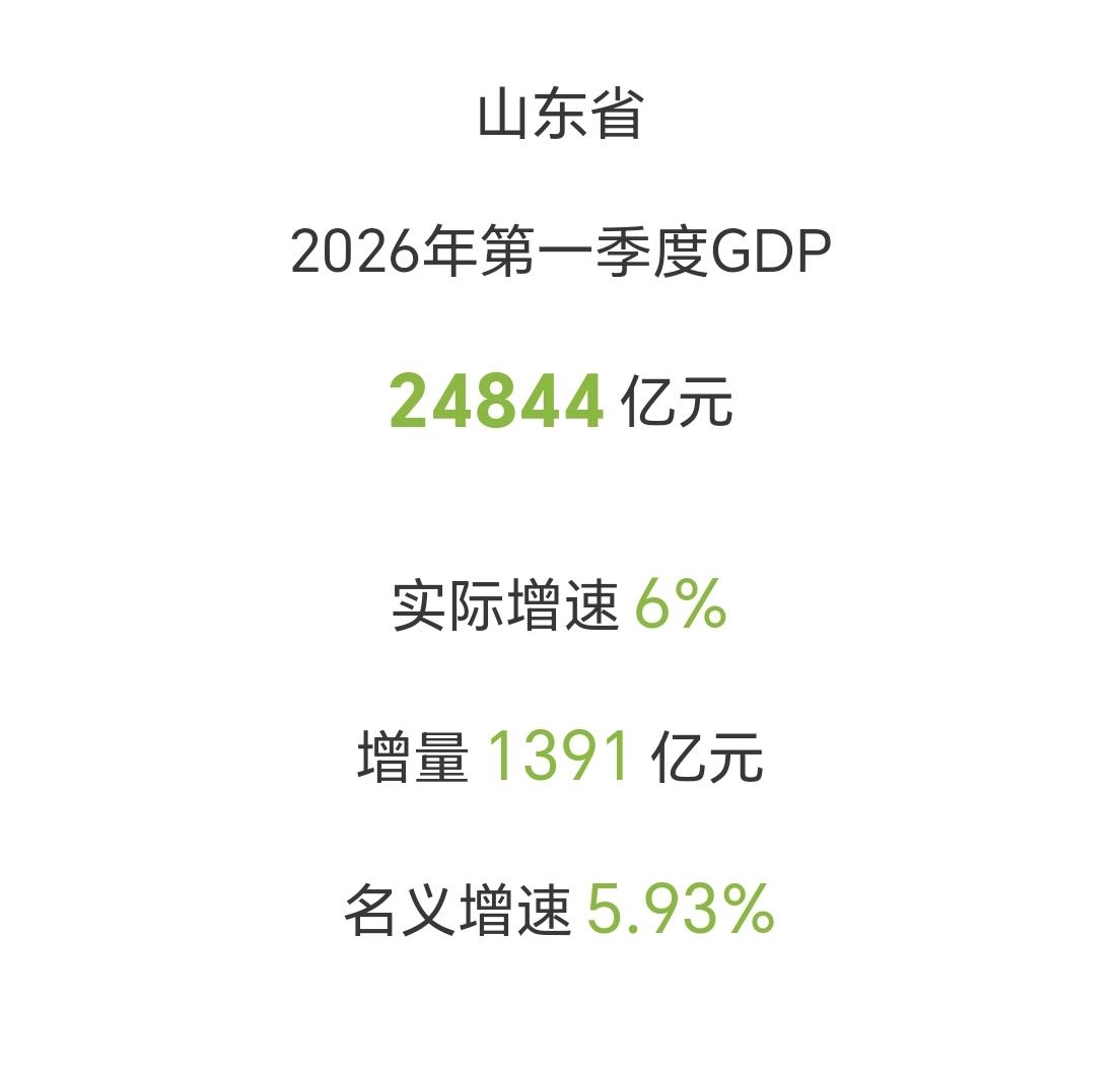 【2026年一季度,山东省GDP超2.48万亿元,增量接近1400亿元】 我们一起来看看,山东省今年一季度GDP完成情况。 一季度,山东GDP累计完成24844亿元,超过了2.48万亿元,其中增量实现1391亿元,接近了1400亿元。 相比于2025年一季度增量1200亿元+,今年一季度的表现显然更加出色。 从增速来看,实际增速6%,名义增速5.93%。 山东经济体量大,增速又快,真的太牛了。 @厦门所见所闻 对于山东省今年一季度GDP增长表现,您如何评价?