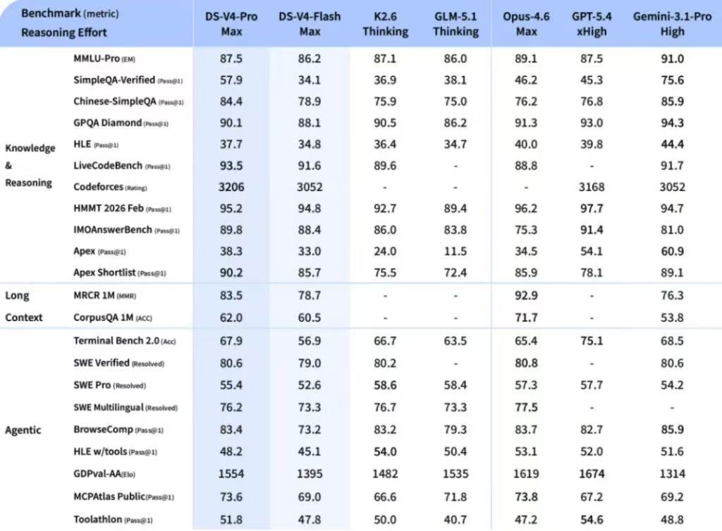 1. 性能:比肩世界顶尖从公开的基准测试来看,无论是推理、代码、数学还是复杂任务处理,V4系列(尤其是Pro版本)已经追上了GPT-5、Opus、Gemini 3.1这些国际第一梯队,不再是“差一口气”的追赶者。