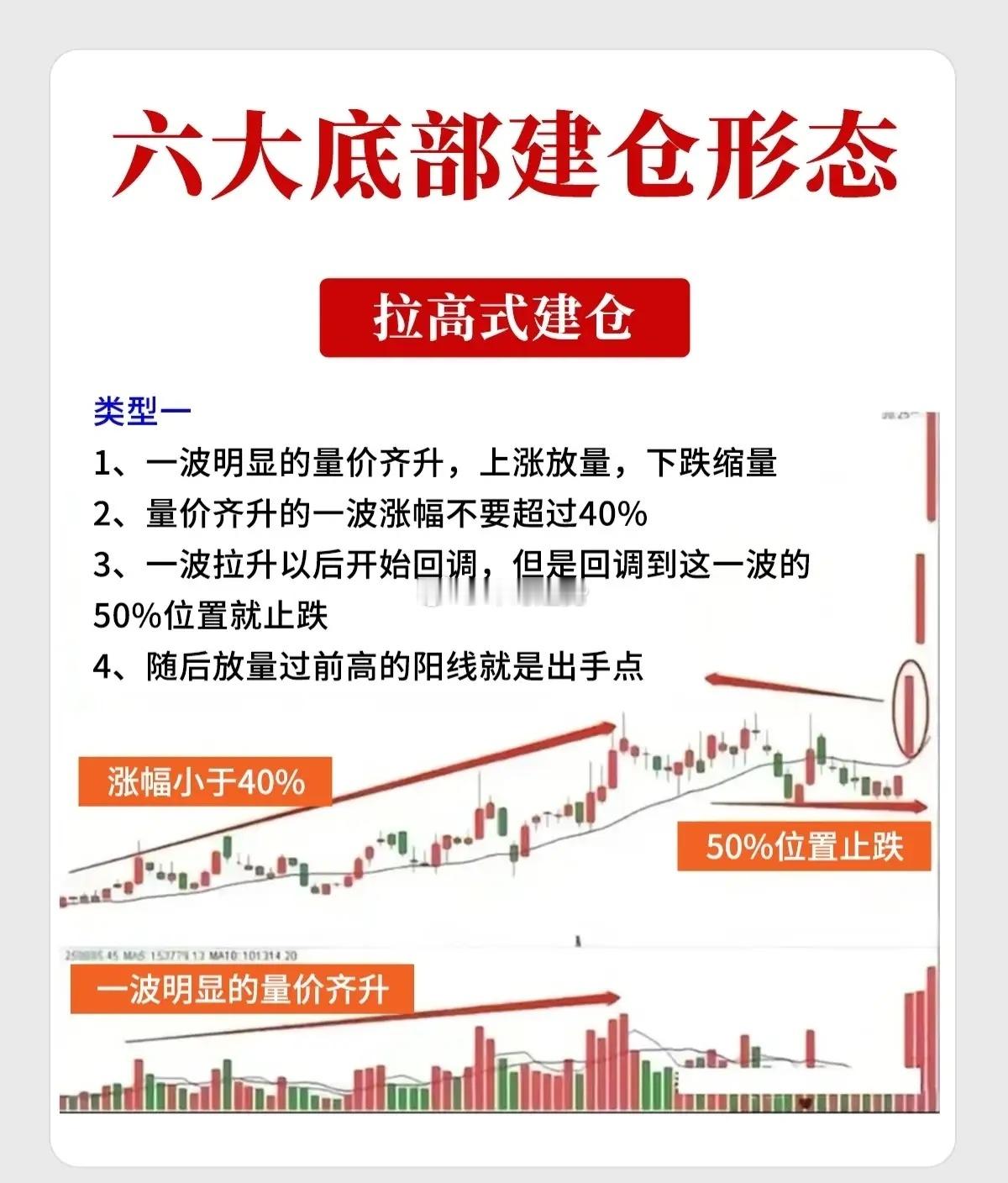 * 形态特征: 1. 量价齐升:初期一波明显的上涨伴随着放量,回调时则明显缩量,体现健康的吸筹节奏。 2. 涨幅控制:这一波拉升的幅度通常不宜过大(一般控制在40%以内),以免过度抬高建仓成本。 3. 中途蓄势:一波拉升后开始回调,但往往会在这一波涨幅的50%位置止跌企稳。 4. 确认信号:随后出现一根放量并突破前期高点的阳线,标志着建仓结束,主升浪开启。