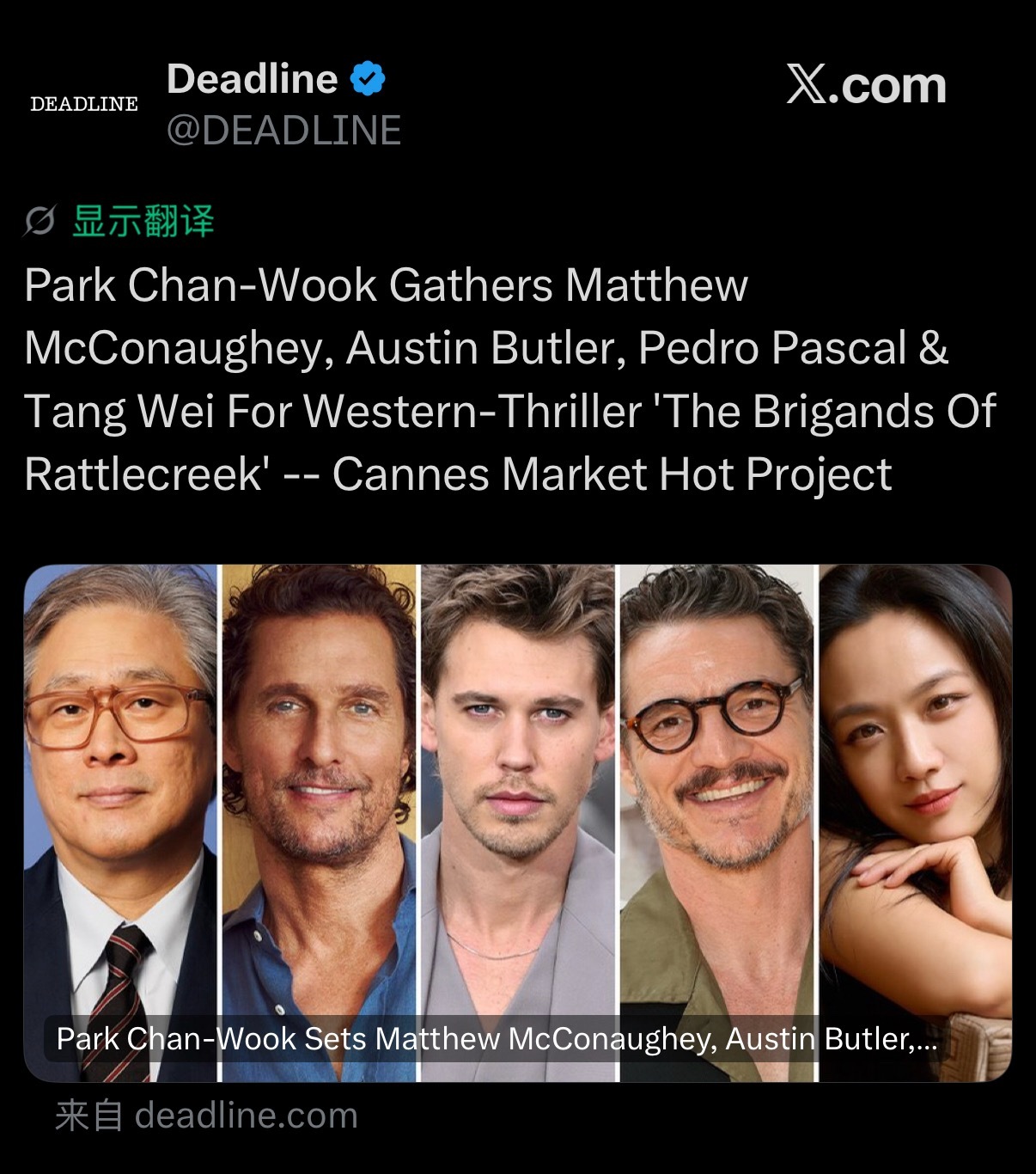 Deadline独家曝光朴赞郁的下一部新片锁定西部惊悚题材,片名为《The Brigands of Rattlecreek》,主演包括马修·麦康纳、奥斯汀·巴特勒、佩德罗·帕斯卡和汤唯。故事设定在美国西部,讲述一名警长与一位医生在暴雨之夜目睹匪徒洗劫小镇、威胁居民,两人联手向这群暴徒展开复仇。影片将延续朴赞郁一贯的作者母题:复仇与报应、暴力的代价,以及记忆与亲情的力量。