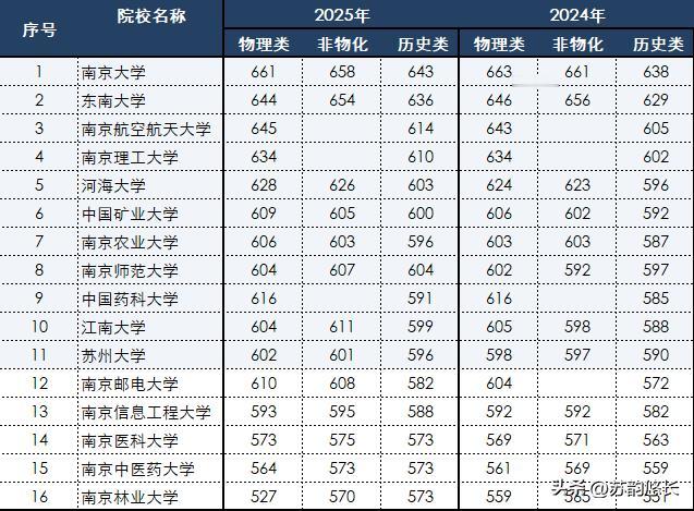 江苏的孩子,苦并快乐着, 这张图一定要给孩子保存好, 不管是文科还是理科方向, 能跑到580分以上的, 在省内都能找到你心仪的大学, 而且出来就业大概率不会太难, 在江苏的16所双一流里面, 几乎覆盖了各行各业。 就像一位高三家长说的那样, 为什么江苏的孩子不愿意出去, 不是他们离不开家, 而是江苏的大学确实比较全, 不管你想学什么专业, 只要分数能到580分以上, 几乎都能找到与之匹配的大学。 从985到211,再到双一流, 各层次都有, 离家又比较近, 可能好几个同学都在一个学校上大学, 圈子都是现成的, 最后就业大概率还会在江苏, 除了中上985和顶部211, 出去真的没有必要, 这一点已经是很多人的共识, 从这一点来说, 江苏孩子是幸福的。 2025年, 16所双一流在省内招生总计约3.5万人, 而580分以上江苏共计约6.6万人, 相当于53%的人留在江苏省内了, 这6.6万人,算是江苏比较优秀的学生, 至于580分以下, 江苏的学校更多, 整个江苏有近80所本科院校, 如果说580分以上走出去的学生, 同样的分数能换一个更好的大学, 还算是有一定的意义, 而580分以下走出去的意义几乎不大, 这些年身边熟悉的孩子, 除了C9级别, 几乎很少看到有人走出去, 这也导致了所有江苏高校, 在本省的录取分数线节节攀高, 南航、南理工特别明显, 甚至南邮、南信的分数都高不可攀, 这是江苏孩子苦恼的地方。