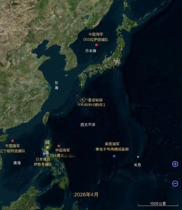 中国海军“辽宁”舰大编队和“遵义”舰编队似乎都美日“肩并肩”演习构成了左右夹击的一个态势。 其中“辽宁”舰航母编队就是卫星照片上发现的那14艘,而且带着075两栖攻击舰和潜艇。 目前在南海。“遵义”舰编队就是官方刚公布的在菲律宾吕宋岛以东107编队,1艘055、1艘052D、1艘054A和1艘903。两个编队刚好在日本“伊势”号编队的左和右,包围了整个演习现场。 目前中国海军舰艇编队在西太平洋海上形势简图: —位于日本海的中国海军055拉萨舰编队,包括 052D型驱逐舰贵阳舰、成都舰以及903A型综合补给舰可可西里湖舰(240单元垂发); —位于南海的中国海军辽宁舰航母特混舰队,包括075两栖攻击舰、071两栖船坞登陆舰、055型驱逐舰、052D型驱逐舰、054A型护卫舰等10余艘作战舰艇; —位于吕宋岛以东海域的中国海军055遵义舰编队,包括052D合肥舰、054A型护卫舰咸宁舰和903A型综合补给舰骆马湖舰(208单元垂发); —停靠苏比克湾参加美日菲肩并肩军演的日本海自伊势号(DDH-182)编队,包括雷号驱逐舰(DD-107)和下北号(LST-4002)登陆舰; —4月22号离开关岛的美国海军拳击手号(LHD-4)两栖戒备群,包括波特兰号两栖船坞登陆舰(LPD-27)和康斯托克号登陆舰(LSD-45),是否参加美日菲肩并肩军演尚未确定