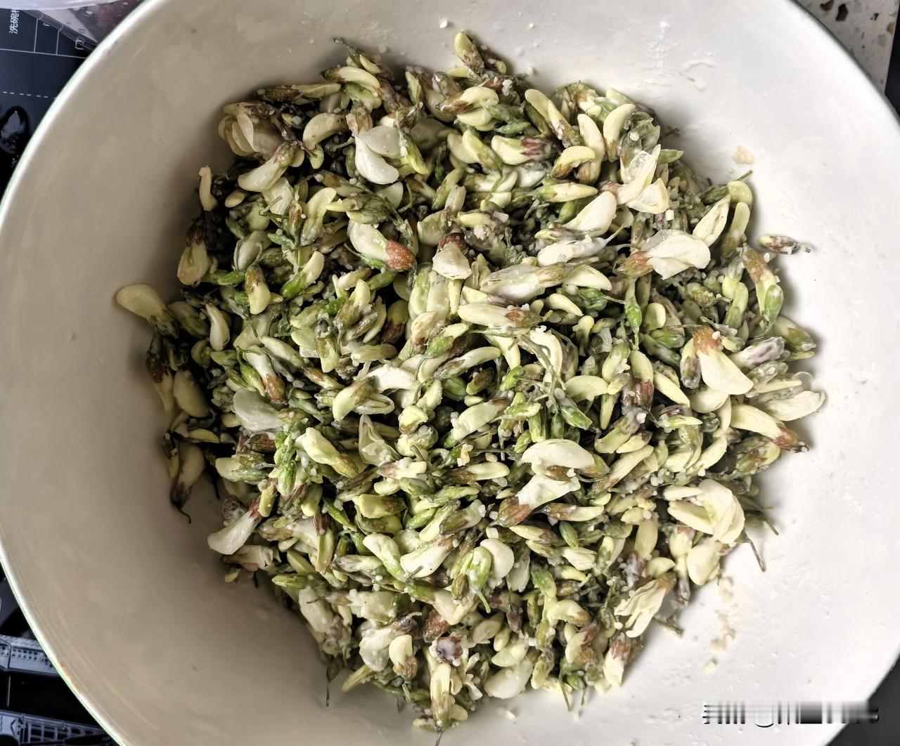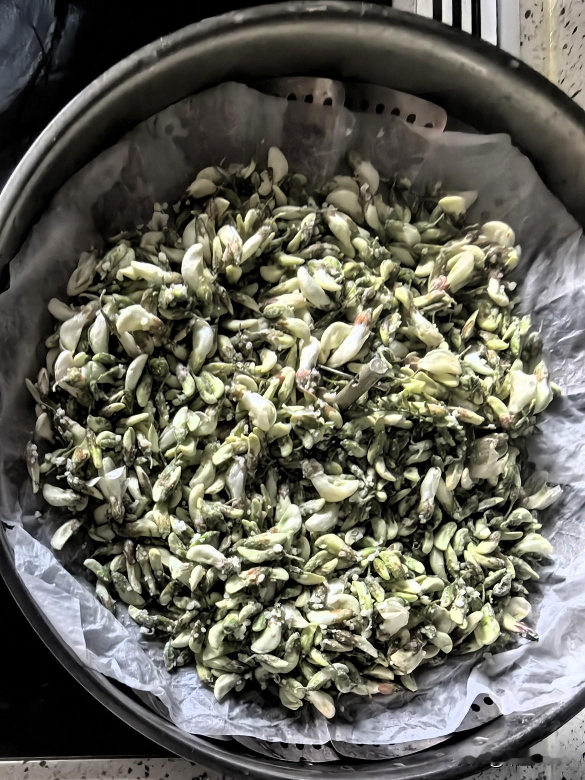蒸槐花这道菜,小时候吃过,那时还在新疆疏勒18团,是妈妈做给我们吃的,我觉得味道很特别。一直珍藏于我的记忆深处,温暖脆弱感性十足。 之后再也没有吃过这道菜。 我在湖南的山城里没有看见过槐树和槐花。 在武汉也没有看见过。 前天去山姆倒是看见卖槐花了,一盒盒整整齐齐的摆放在冷藏间货架子上。很新鲜。我毫不犹豫,立马拿了一盒。 昨天想做了,可是真不会。先是在网上搜,后又求助于姐姐。 洗净,滤干水份,先放油,再放玉米粉和面粉,家里没有面粉,我加了蒸粉蒸肉用的米粉,拌均,尽量让槐花都裹上粉沫。 然后上锅蒸10分钟,蒸好就着热气加点盐。 成功! 还真是香,确实是童年的味道。 是我梦中的味道。久违了近50年了,再次吃上,情素复杂。 真好!感谢槐花和4月。