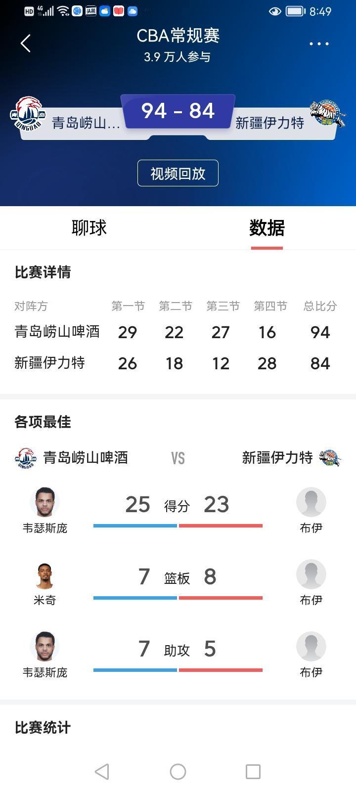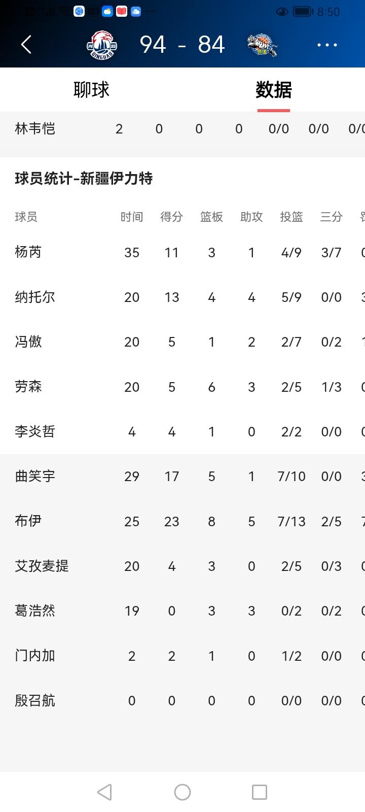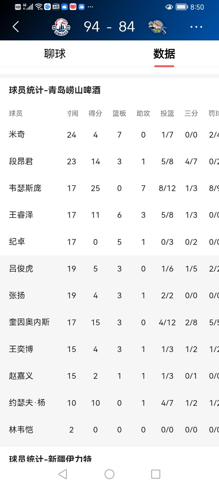 昨晚新疆队与青岛队的42轮比赛,我通过新疆体育频道观看了现场直播。 主力残缺的新疆队与青岛队根本不在一个级别上,我想新疆队肯定会输。只是让我没有想到的是,新疆队打得并不差。不论是年轻的球员杨芮曲笑宇,还是外援纳托尔布伊,大家都没有完全放弃,拼劲十足。特别是第4节,新疆队单节拿下了28分,最终双方84:94,新疆队只输了10分,不算多,喜欢新疆队的球迷还能接受。 新疆队无缘季后赛也没有啥大不了的。 只是希望下赛季都重整旗鼓,选好外援,用好本土球员,打出新疆队的气势来。