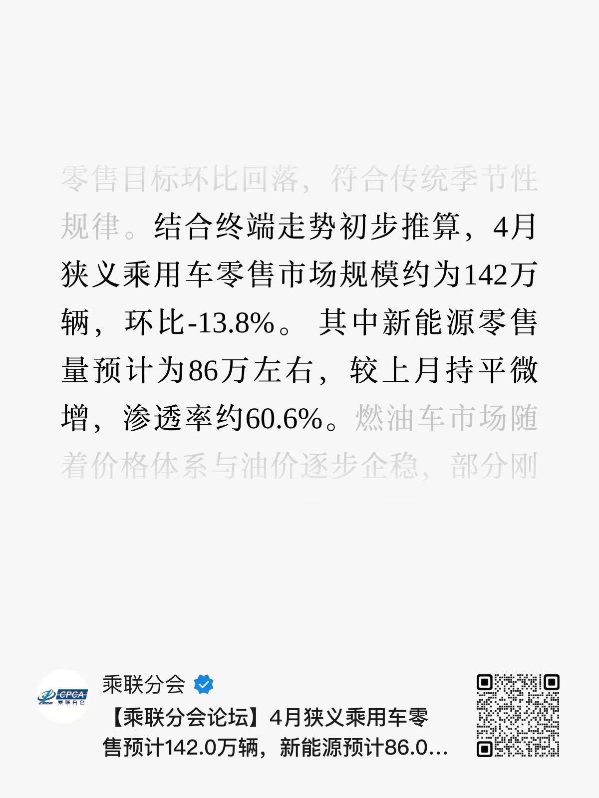 4月预计乘用车销量142万辆,燃油车56万辆,新能源86万辆,新能源渗透率飙升至60%;