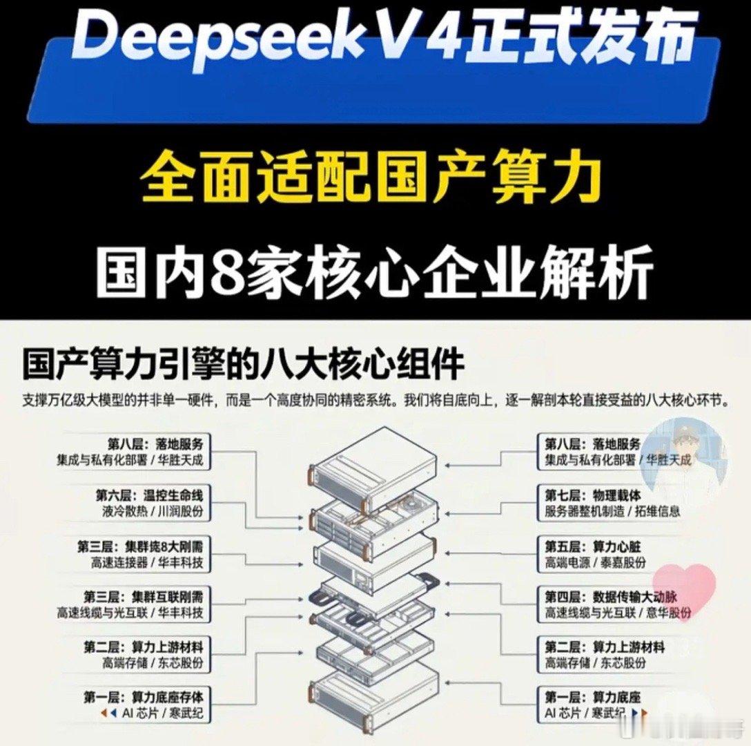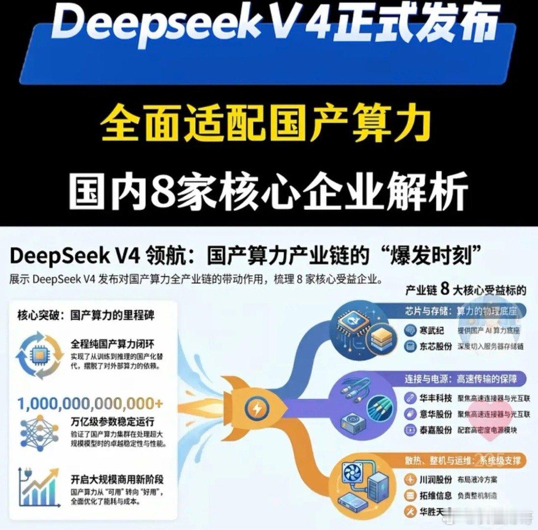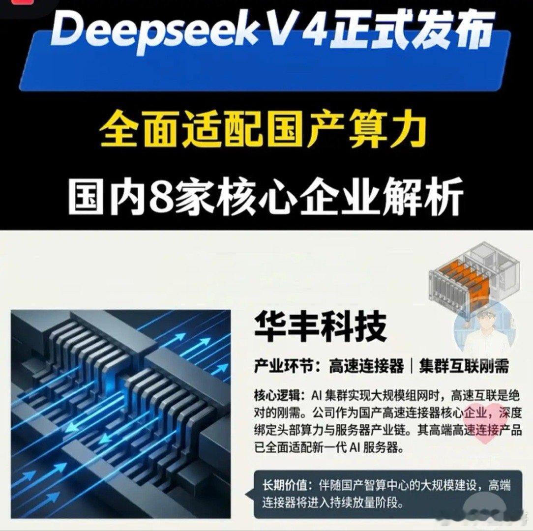 DS的V4亮相,验证的是国产算力产业链最核心的技术已经�突破并商业化。4月24日,当A股处于大调整好,DeepSeeK的V4版本发布了,大模型开源、好用、成本超低的优势,瞬间让与DS合作的公司股价暴涨。本人一直关注的华为昇腾板块大涨,持了三个多月的华丰科技、海光信息、长川科技、华虹公司落袋了,收获满满。国产算力产业链是今年算力板块的核心之一,后边还有好戏,要敢于在回调到位时又买回来的定力。