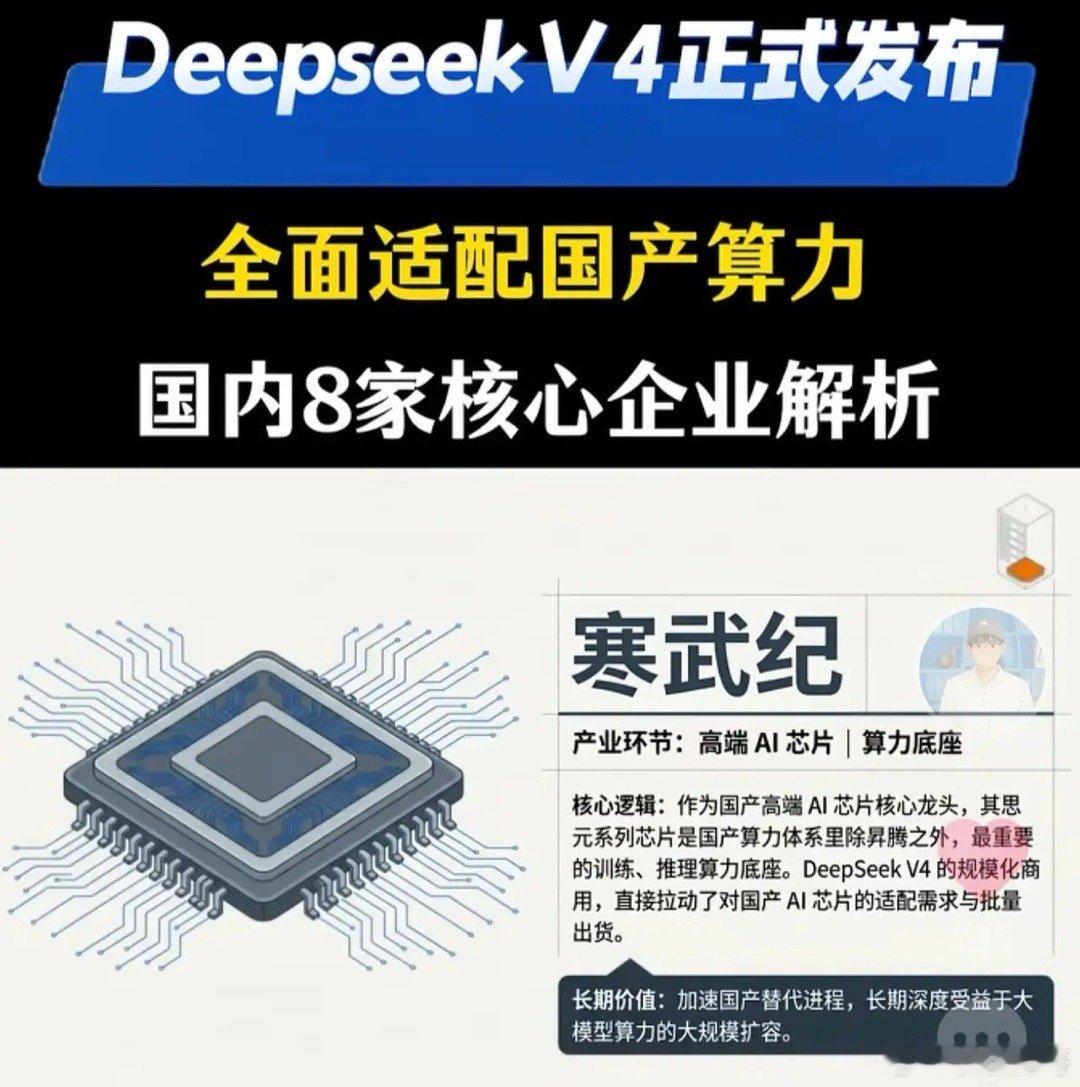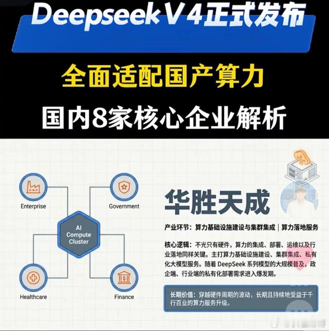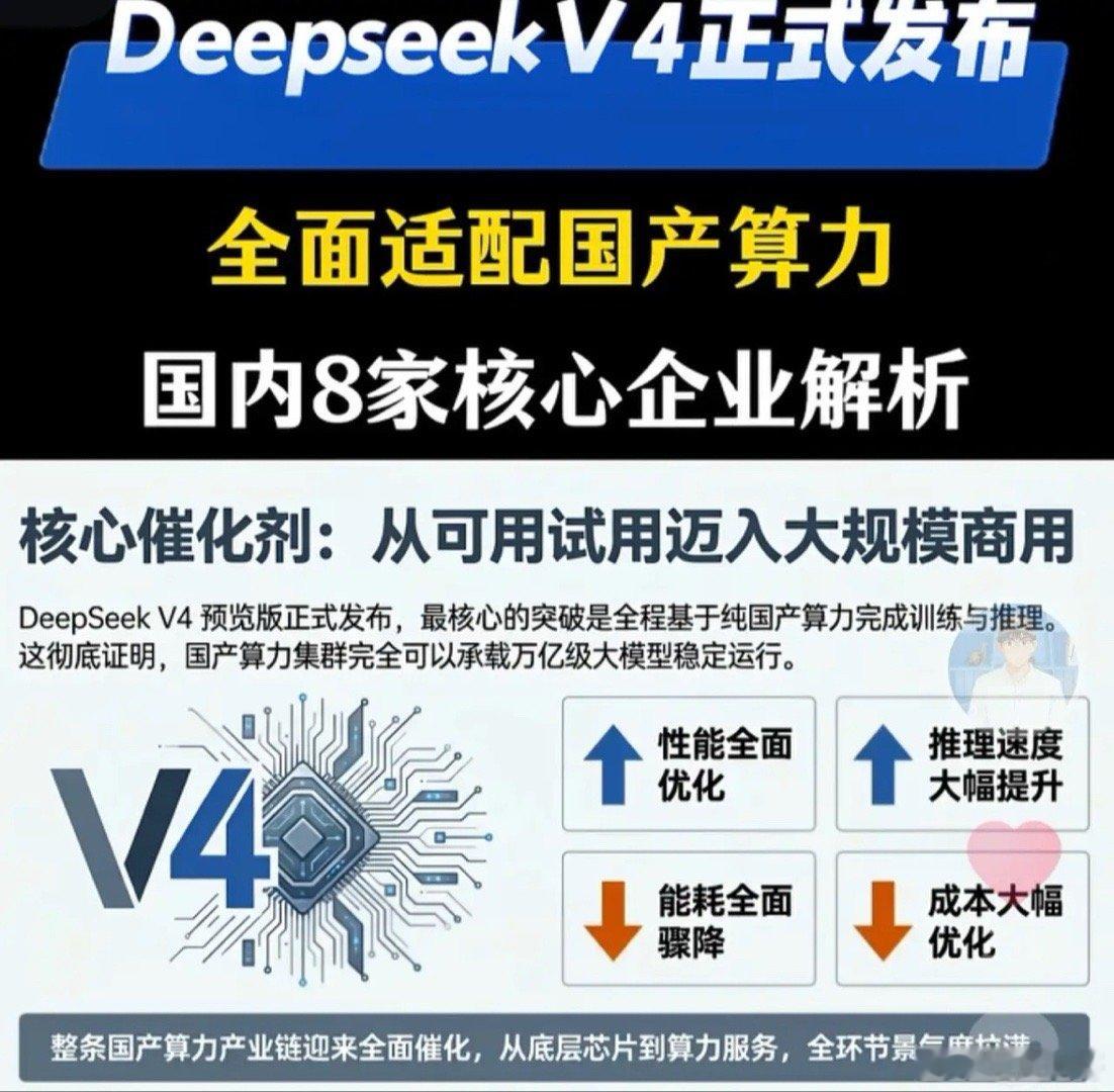 DS的V4亮相,验证的是国产算力产业链最核心的技术已经�突破并商业化。4月24日,当A股处于大调整好,DeepSeeK的V4版本发布了,大模型开源、好用、成本超低的优势,瞬间让与DS合作的公司股价暴涨。本人一直关注的华为昇腾板块大涨,持了三个多月的华丰科技、海光信息、长川科技、华虹公司落袋了,收获满满。国产算力产业链是今年算力板块的核心之一,后边还有好戏,要敢于在回调到位时又买回来的定力。
