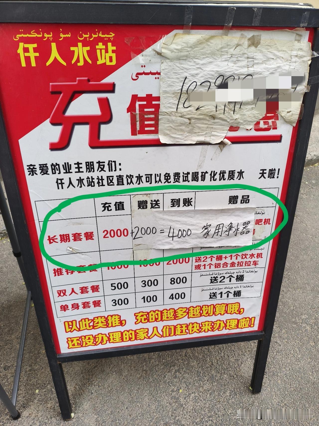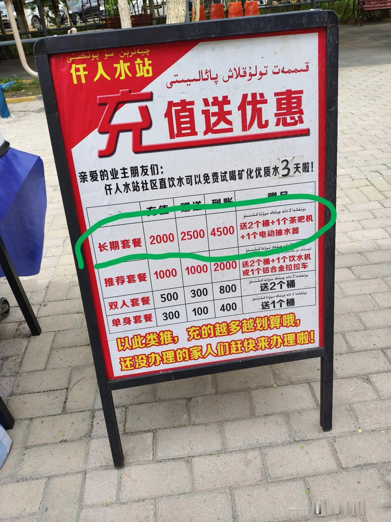 办水卡充钱的套路。哪个更划算? 昨天下午,我去单位那边的小区里给我们保安打水。发现充水卡的人套路又变了。 如果不是有我之前拍的照片,还真看不出来哪里变了? 只见小区一进门的空地上又多了一个板车,板车上面放了个大纸箱。板车的车把手上绑着一个大人编织袋(下图),上面用碳素笔歪歪扭扭的写着:充2000送2000到账4000,再送一个加用净水器(图1,图2,图3) 可前两天放的牌子上却写着:充2000送2500到账4500,送2个桶+一个茶吧机+电动净水器(图4图5图6) 瞬间,就觉得这些人的套路可真多。 这次,他们在小区里搞活动一共三天,也就给居民提供免费打水三天。 但是,办水卡充钱的优惠政策却变了又变。(对比两个牌子上的内容就知道了)都不知道他们玩的是啥套路? 第一天,牌子上写着充2000送2500到账4500,送两个桶+一台茶吧机+一个电动饮水机( 图6)。 第二天,我们保安还有水喝,所以我没去打水。 第三天,就发现牌子上面写着充2000送2000到账4000,送两个桶+一个家用饮水机(图3)。也不知道他们玩的是啥套路? 你们大家觉得他们玩的是啥套路?你们大家觉得哪个套餐更划算?如果是你的话,你会办那个套餐?我觉得羊毛出在羊身上,应该都差不多吧?欢迎大家在评论区留言。我要上精选-全民写作大赛 我是来唱歌的欢欢,平时喜欢唱歌,但是更爱美食,如果喜欢我就点赞关注我吧!