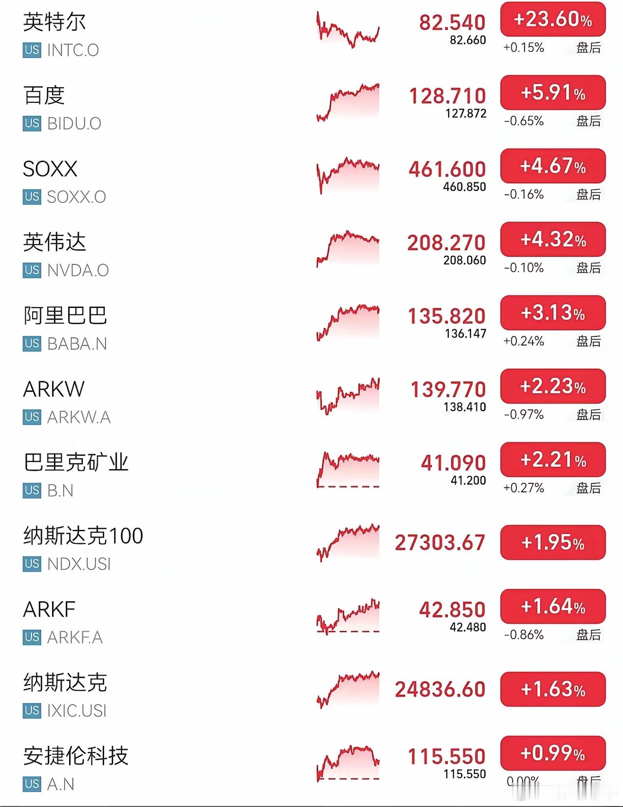 史诗级涨幅,英特尔大涨24%,美股主动基全线大涨!美股分享昨晚美股的走势还是比较震撼的,两天小回调后,再次创下了历史新高!以纳斯达克为例子,昨晚高开高走,盘中没有一点拖泥带水。昨晚为何如此优秀?首先就是盘前英特尔公布财报,随后股价直接飙升20%。还有伊朗代表团来到了巴基斯坦,虽然不直接和美谈判,但是也确确实实想谈判了!昨晚三大指数方面道指跌79.61点,跌幅为0.16%纳指涨398.09点,涨幅为1.63%标普500指数涨56.68点,涨幅为0.80%