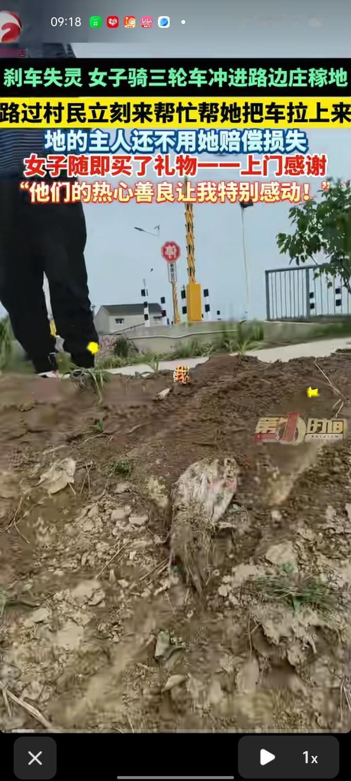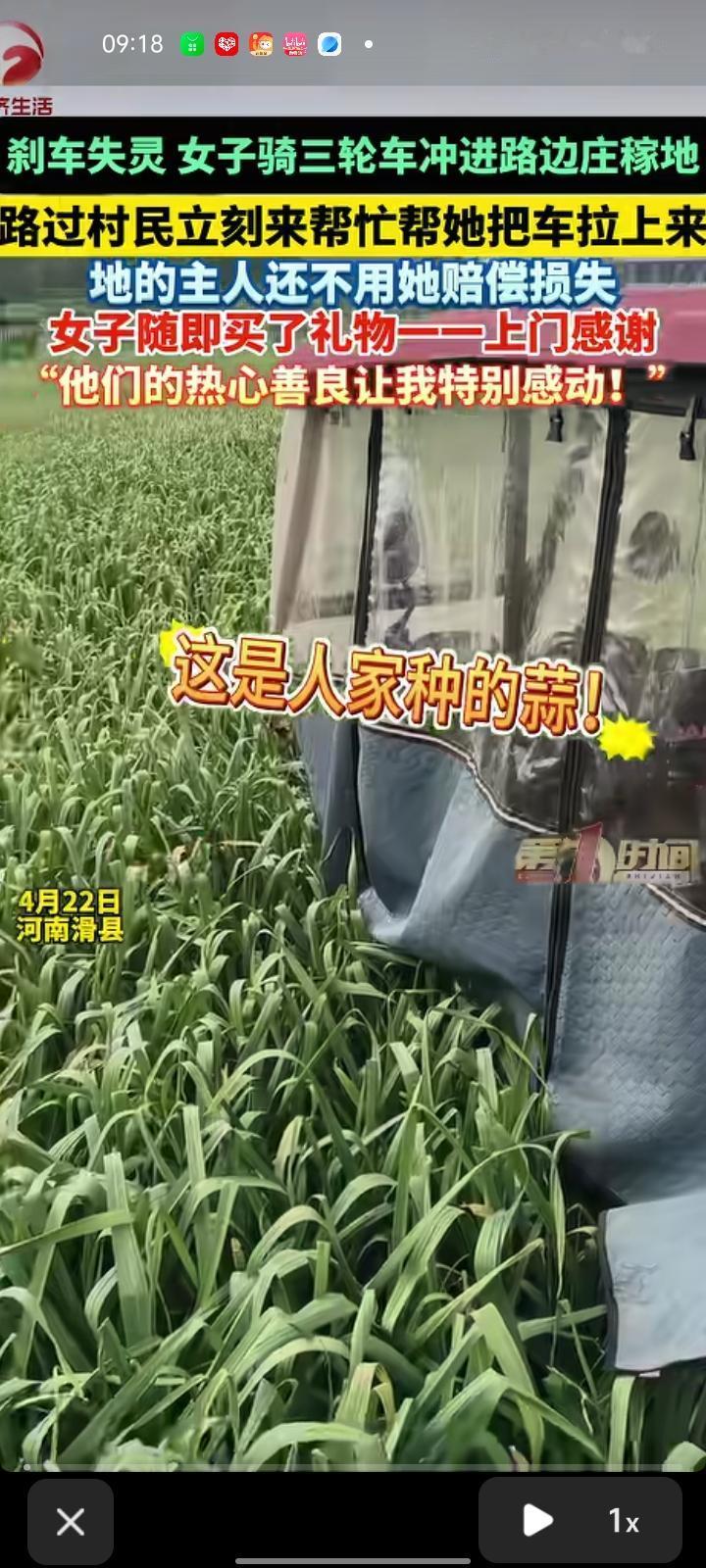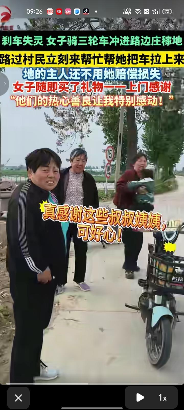 4月22日,安阳市滑县。郑女士骑着三轮车去接孩子,不料三轮车刹车突然失灵,车一下子冲进路边的庄稼地里。她当时特别无助,毕竟那是刚浇的地,都是淤泥和水,坡太高叶上不来。路过大爷看到后,立刻回家拿绳子,然后找一伙人来帮车拉上来。 事后,女子想着给庄稼地主人赔偿一点,但被主人拒绝,她心里过意不去,就买了点礼物一一上门感谢。