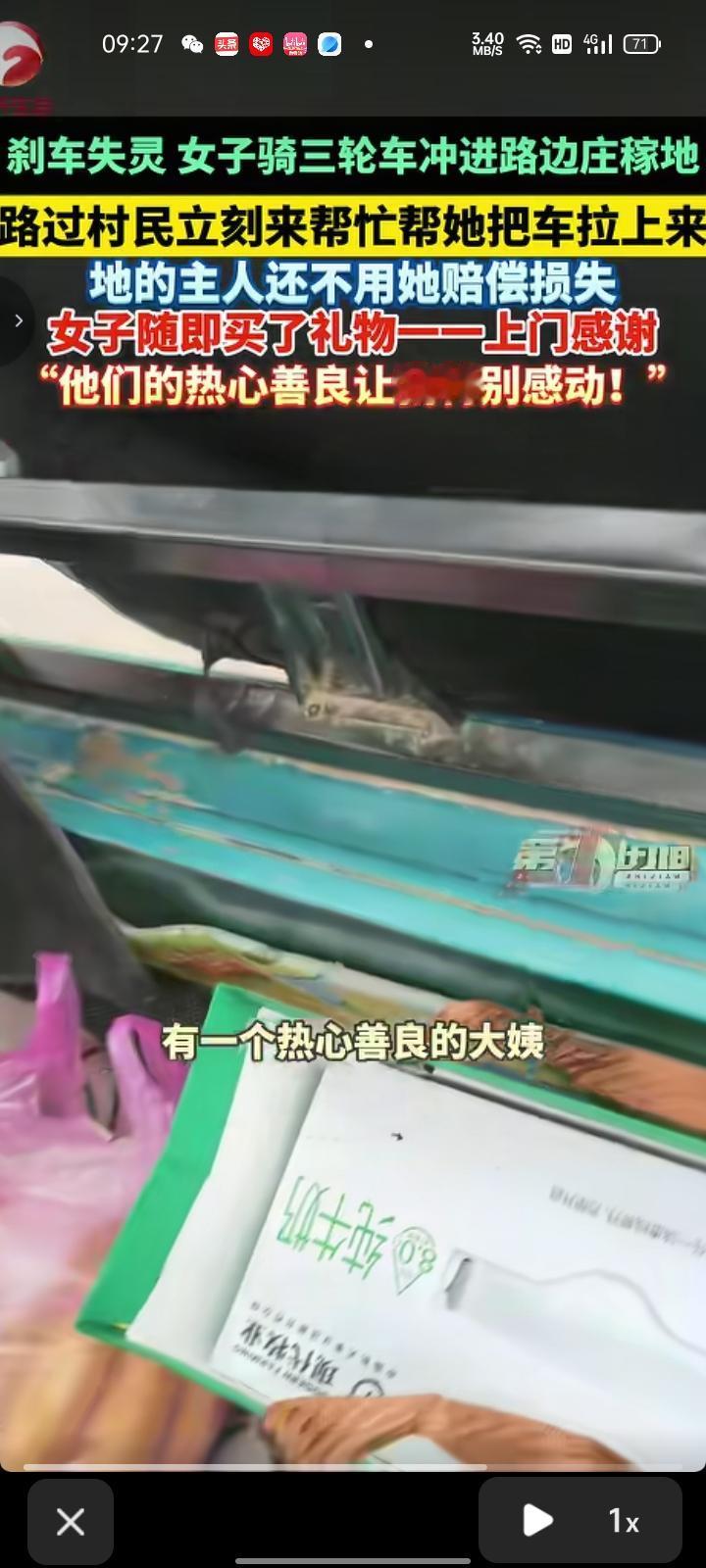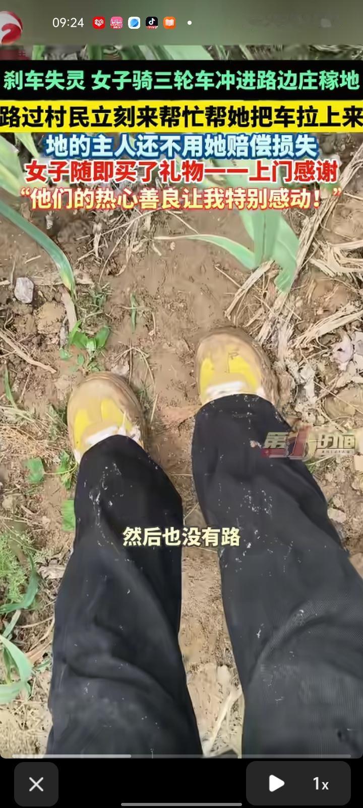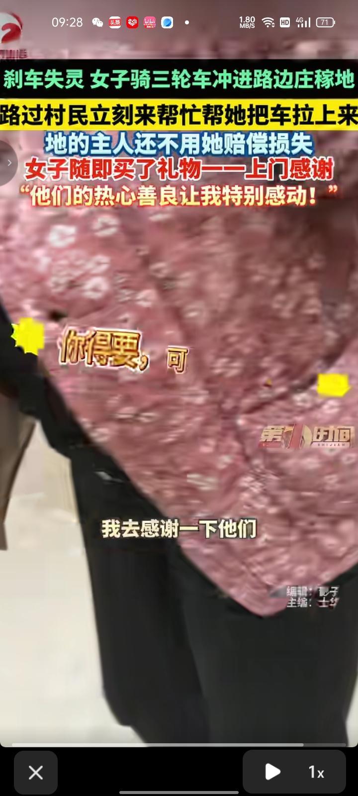 4月22日,安阳市滑县。郑女士骑着三轮车去接孩子,不料三轮车刹车突然失灵,车一下子冲进路边的庄稼地里。她当时特别无助,毕竟那是刚浇的地,都是淤泥和水,坡太高叶上不来。路过大爷看到后,立刻回家拿绳子,然后找一伙人来帮车拉上来。 事后,女子想着给庄稼地主人赔偿一点,但被主人拒绝,她心里过意不去,就买了点礼物一一上门感谢。