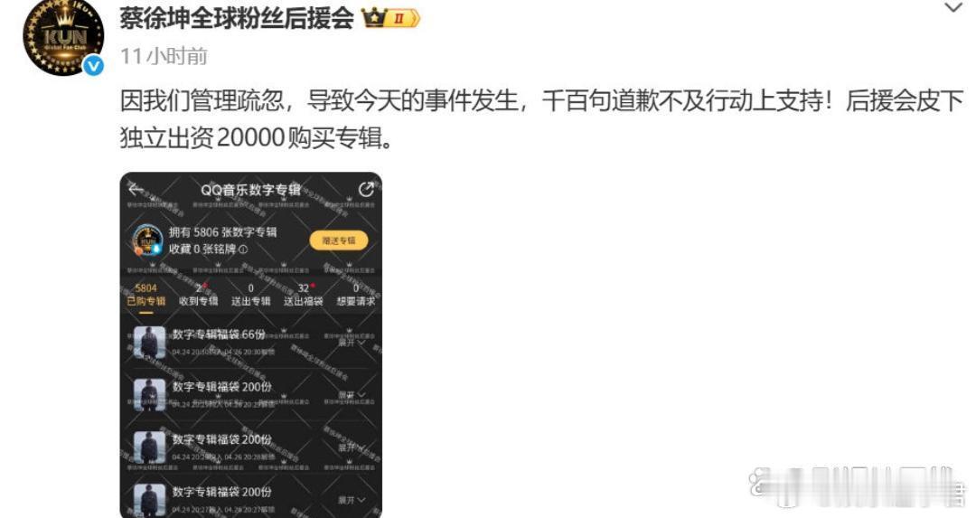 蔡徐坤后援会切错号蔡徐坤后援会切错号误转丁程鑫微博,后援会回应称涉事人员系一年前曾担任后援会运营组的人员,该人员并非账号核心管理,并出资20000购买蔡徐坤专辑。