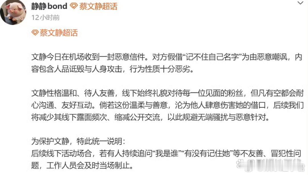 蔡文静被代拍挤哭24日,蔡文静在上海机场遭代拍疯狂围堵,众人近距离紧跟、围追堵截,场面拥挤混乱,蔡文静被挤到当场情绪崩溃落泪。随后,工作室还披露蔡文静在机场收到伪装成粉丝的恶意信件。