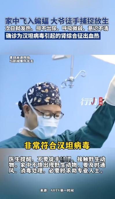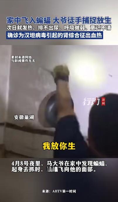 “悲剧还是发生了!”近日,安徽巢湖,一位大爷发现家中进了只蝙蝠,他伸手就去抓,可蝙蝠直接冲向了他的面部。大爷在那儿碎碎念,我放你生,你不要害我。可没想到第二天大爷就病了,被送去医院抢救!网友:徒手,怎么敢的呢? 在安徽巢湖,有一户普通的老百姓家里,半夜三更的时候,窗帘上突然冒出一只蝙蝠,老太太被奇怪的动静惊醒,吓得心里慌慌的,今年 68 岁的马大爷(化名)赶紧跑过来,就想把这个突然闯进来的小家伙给赶出去。 他当时也没戴手套,也没找任何工具,直接徒手伸手去抓,蝙蝠一下子受了惊吓,猛地朝着他脸上扑了过去,大爷下意识伸手一把就攥住了,最后他也没伤害蝙蝠,还是把它放走了,还对着蝙蝠飞走的方向随口念叨了一句:我放你走,你可别伤害我。 在大爷眼里,自己这就是做了一件行善的好事。 问题从第二天开始出现,中午左右,他突然发冷、发烧,腰疼得厉害,像刀割一样,更严重的是,他开始尿不出来,家人一看不对劲,赶紧送医院。 送到时,人已经有点意识模糊,呼吸也变弱,医生直接让进ICU。 检查结果出来后,情况很危险,肾功能指标严重异常,属于急性肾损伤,还伴随全身炎症反应,医生反复追问病史,得知他徒手抓过蝙蝠,立刻怀疑是病毒感染。 最后经过检查确诊,得的是肾综合征出血热,说白了就是汉坦病毒感染引发的病,医生特意解释说,这种病毒大多是老鼠身上带的,不过蝙蝠这类野生动物也有可能携带,而且不止是被咬一口才会传染,动物的分泌物、飞沫,一旦碰到身上破皮的伤口,或是眼、鼻、嘴这些黏膜部位,都有很大概率被感染。 马大爷就是这种情况,没被咬,但蝙蝠挣扎时的分泌物溅到了脸上,病毒就从这些“薄弱点”进去了。 这种病来得很快,潜伏期短,发病急,它主要攻击肾脏,最典型的危险信号就是尿不出来,如果再拖,可能引发高钾血症,严重的话会导致心脏停跳。 ICU里,医生一边用抗病毒治疗,一边靠透析维持肾功能、调整电解质,病情反反复复,有时清醒,有时昏迷,家人在外面守着,越想越后怕,就因为徒手抓了一只蝙蝠,差点出大事。 类似的情况不是个例,陕西有村民徒手抓蝙蝠,没做消毒,三天后发烧,被确诊感染,河南信阳有人从马桶里捞蝙蝠,被咬后只能打多针疫苗和血清才安心,国外还有人被蝙蝠咬伤后感染狂犬病,最终没救回来。 诸事并观,实则揭示一浅显之理,面对蝙蝠等野生动物,切不可存“无事”之侥幸,它们或携诸多病毒,看似平常,然若接触失当,后果不堪设想。 有人看到新闻会心疼马大爷,觉得他只是好心,也有人开始后怕,想起自己以前也接触过类似动物,还有人情绪更激动,觉得干脆把蝙蝠都清除掉。 但问题不在“善不善”,而在有没有基本防护。 医生给的建议其实很直接,家里进了野生动物,先开窗通风,不要慌着动手,更不要徒手去抓,如果处理不了,就找专业人员。 好在马大爷最后挺了过来,从ICU转危为安,相当于捡回一条命,但这种“运气”,不能指望每个人都有。 说到底,面对野生动物,最安全的做法就三点,不碰、不逞强、不赌运气。善意如果没有防护,很容易变成风险。 这件事给人的提醒也很简单,别因为一时好心,把自己送进医院。 参考资料:行动新闻