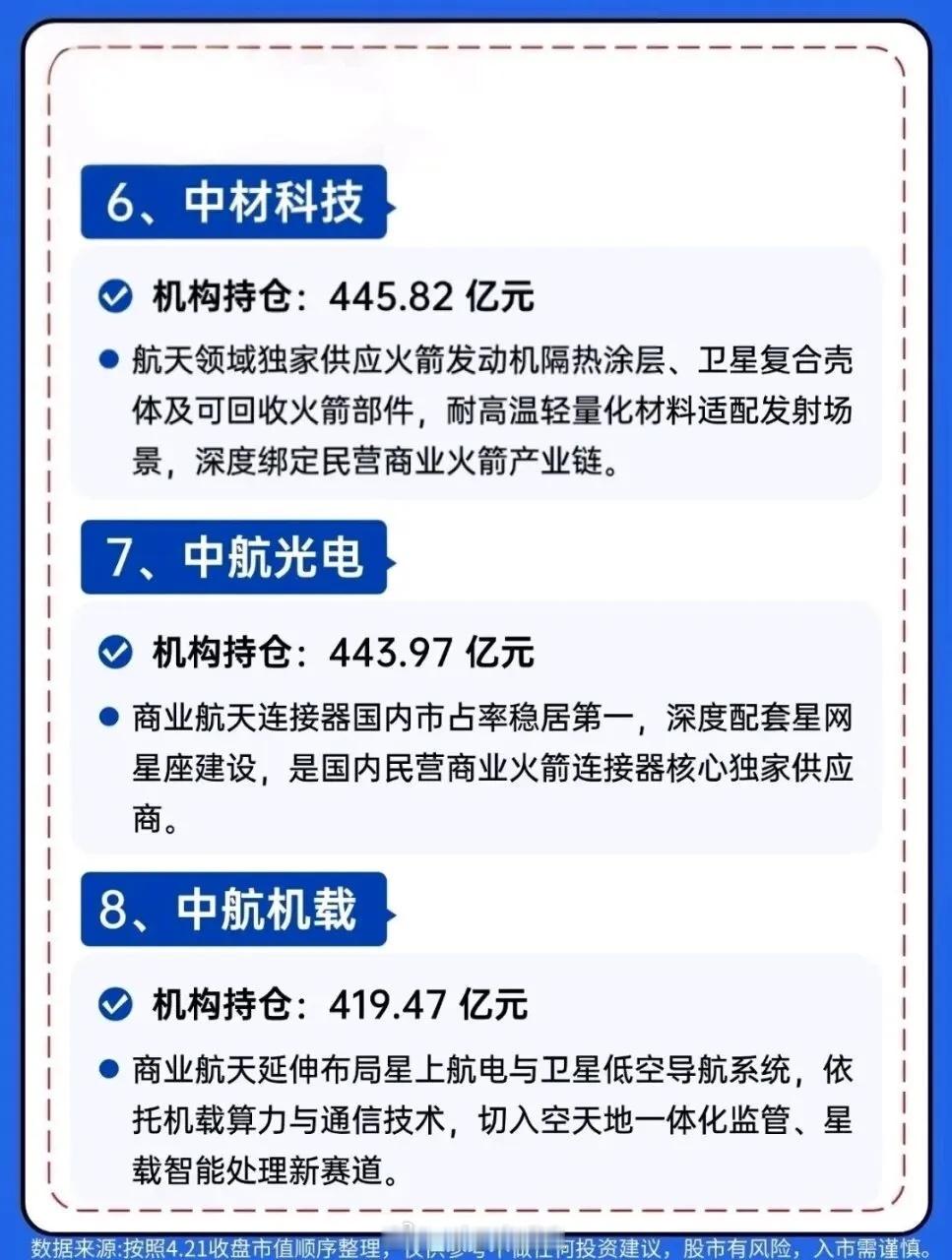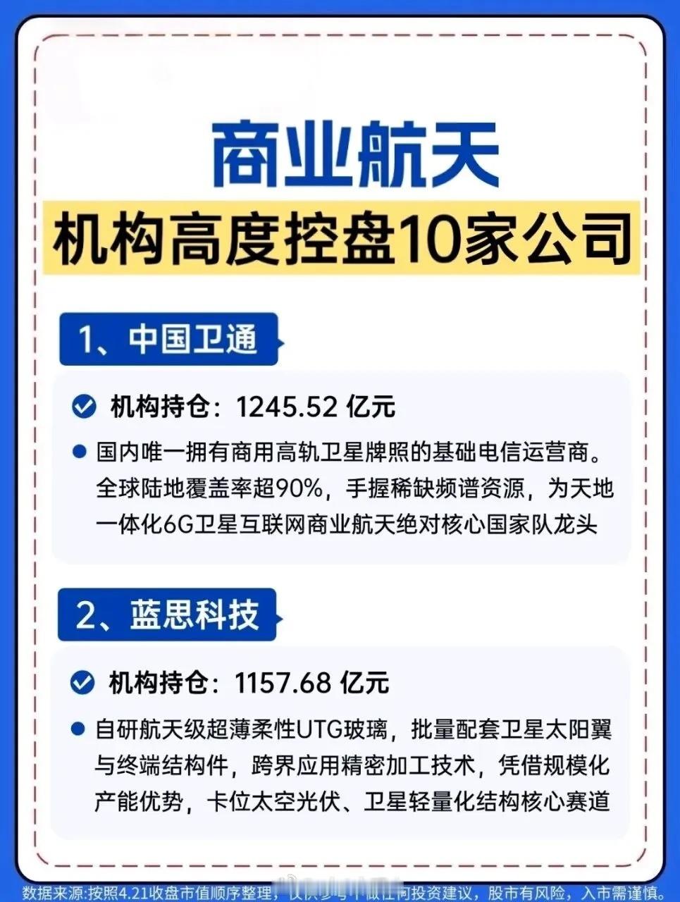 商业航天赛道爆发!机构高度控盘的10家龙头企业名单曝光了,从卫星制造、核心配套到数据服务全产业链覆盖,快来看看有没有您的持仓?中国卫通:机构持仓1245.52亿,国内唯一拥有商用高轨卫星牌照的基础电信运营商。