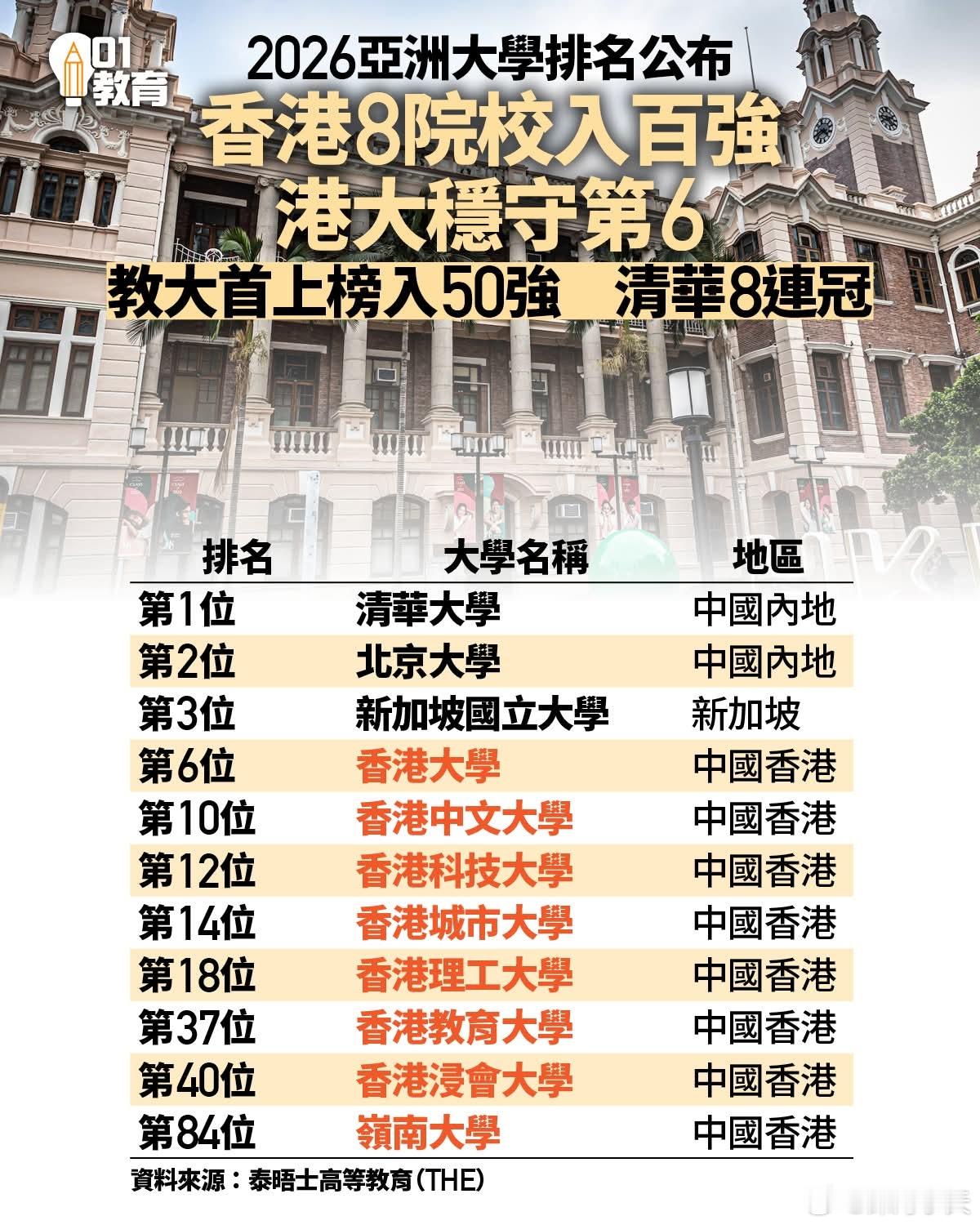 英版亚洲大学排名,香港8间大学全部入百强英国泰晤士高等教育公布2026年亚洲大学排名,清华大学连续第八年蝉联榜首。香港今年8间院校(香港公立大学共8间)打入首100位,亦首有7间大学晋身首50名,比去年多一间。其港大保持第6名,港中大跌一位至第10名,港科大继续排第12名。新上榜院校分别是港教大,排名第37,岭大排名第84位。粤港澳大湾区00后大学生关灯玩手机视网膜脱落