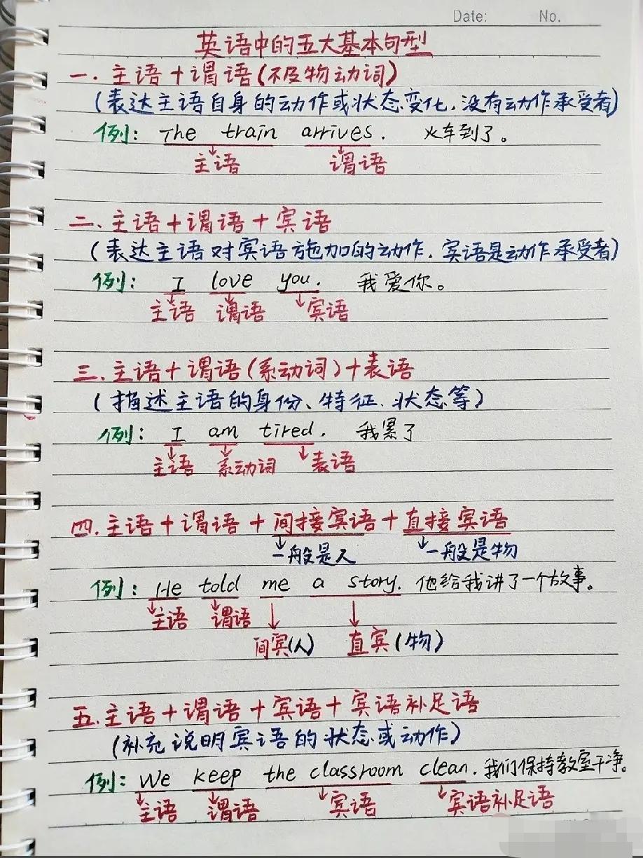 学英语总被复杂句型劝退?其实根本不用死记硬背!掌握三大核心句型,就能搞定90%的句子翻译和写作,零基础也能快速上手,告别中式英语,轻松开口写句子! 英语句子万变不离其宗,核心就三个:有动作就用主谓宾(谁做什么),没动作就用主系表(是什么/怎么样),表存在就用There be(某地有某物)。主谓宾如“I love reading”,主系表如“She is happy”,There be如“There is a book on the desk”。记住语序“主→谓→宾,方→地→时”,造句翻译不翻车。 五大基本句型是进阶关键,主谓、主谓宾、主系表、主谓双宾、主谓宾补,所有长难句都由它们扩展而来。掌握核心句型,不仅能应对日常交流、考试写作,还能助力AI英语学习,提升学习效率,轻松攻克英语难关。 英语学习没有捷径,但有方法!吃透三大核心句型,就能搭建起英语句子的骨架,再复杂的句子也能轻松拆解。坚持练习,你也能脱口而出、下笔有神,赶紧行动起来,一起高效学英语!