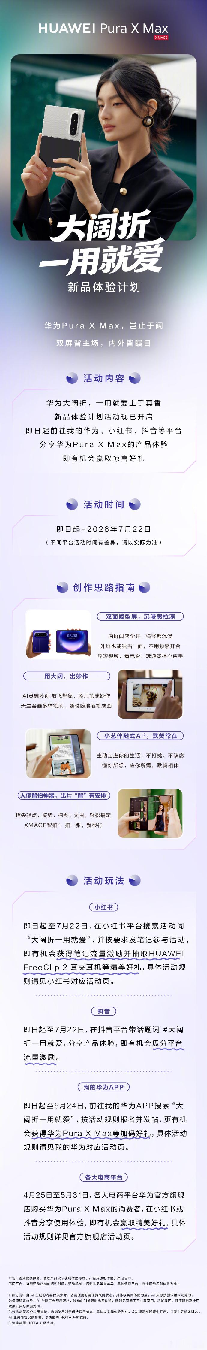华为PuraXMax今日开售4月25日,华为大阔折Pura X Max正式开售,搭载双面阔屏设计,带来全新使用体验。品牌官宣先锋大使助阵,同步开启新品体验活动,用户可在多平台参与分享,上手感受这款折叠新机的独特魅力。华为PuraXMax华为大阔折