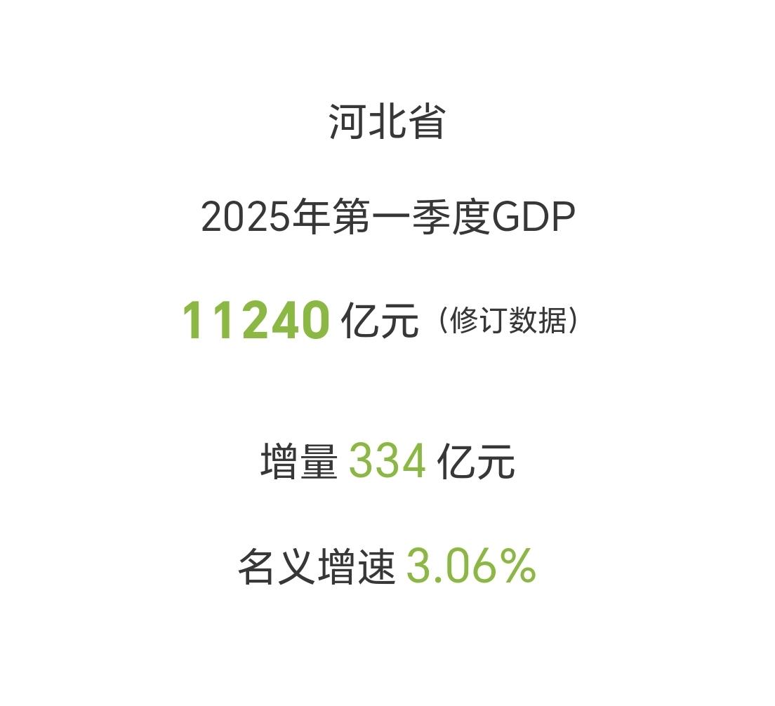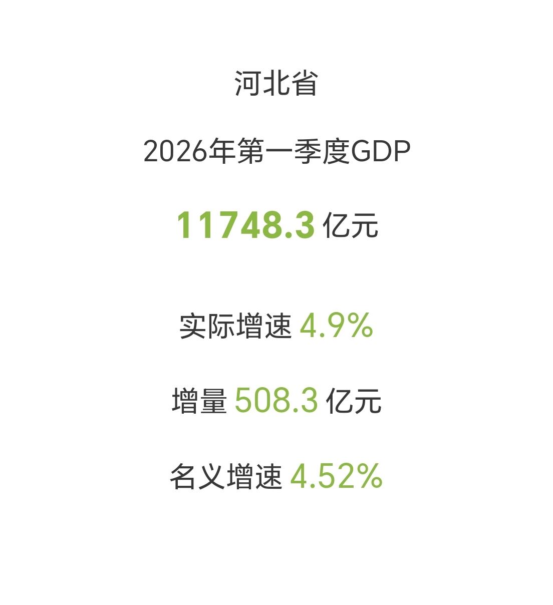 【2026年一季度,河北省GDP超1.17万亿元,增量超500亿元】 大陆31个省市区最后一个出炉一季度的省份,那就是河北省,现在也公布数据了,我们一起关注。 一季度,河北省累计完成GDP11748.3亿元,超过了1.17万亿元,其中增量实现508.3亿元,超过了500亿元。 从增速来看,实际增速4.9%,名义增速4.52%。 @厦门所见所闻 这几年,河北省经济也不太理想,增速低于国家线,对于河北省今年一季度的经济增长表现您如何评价呢?