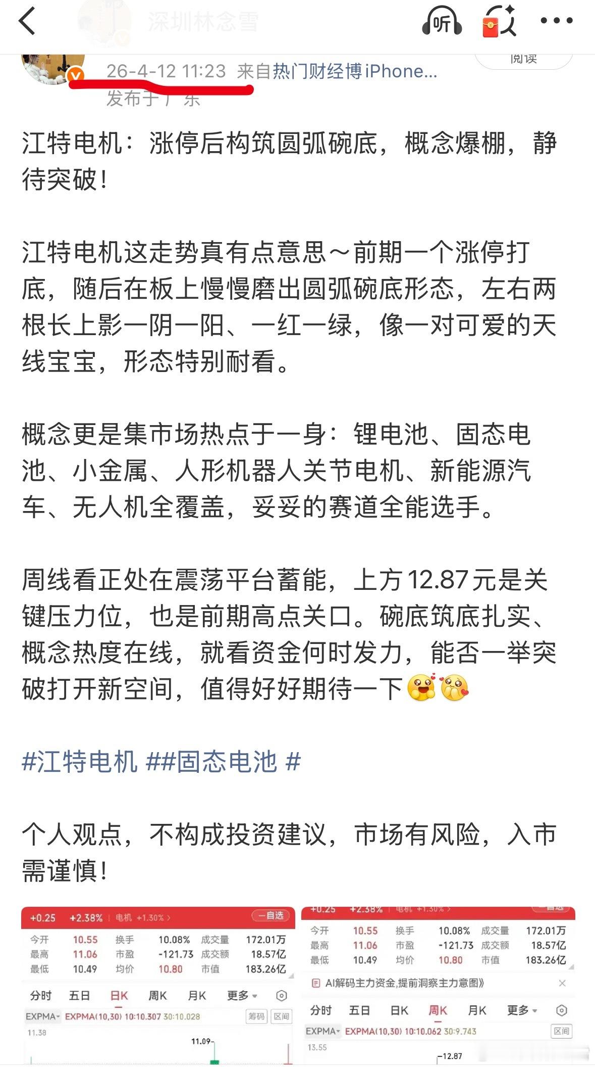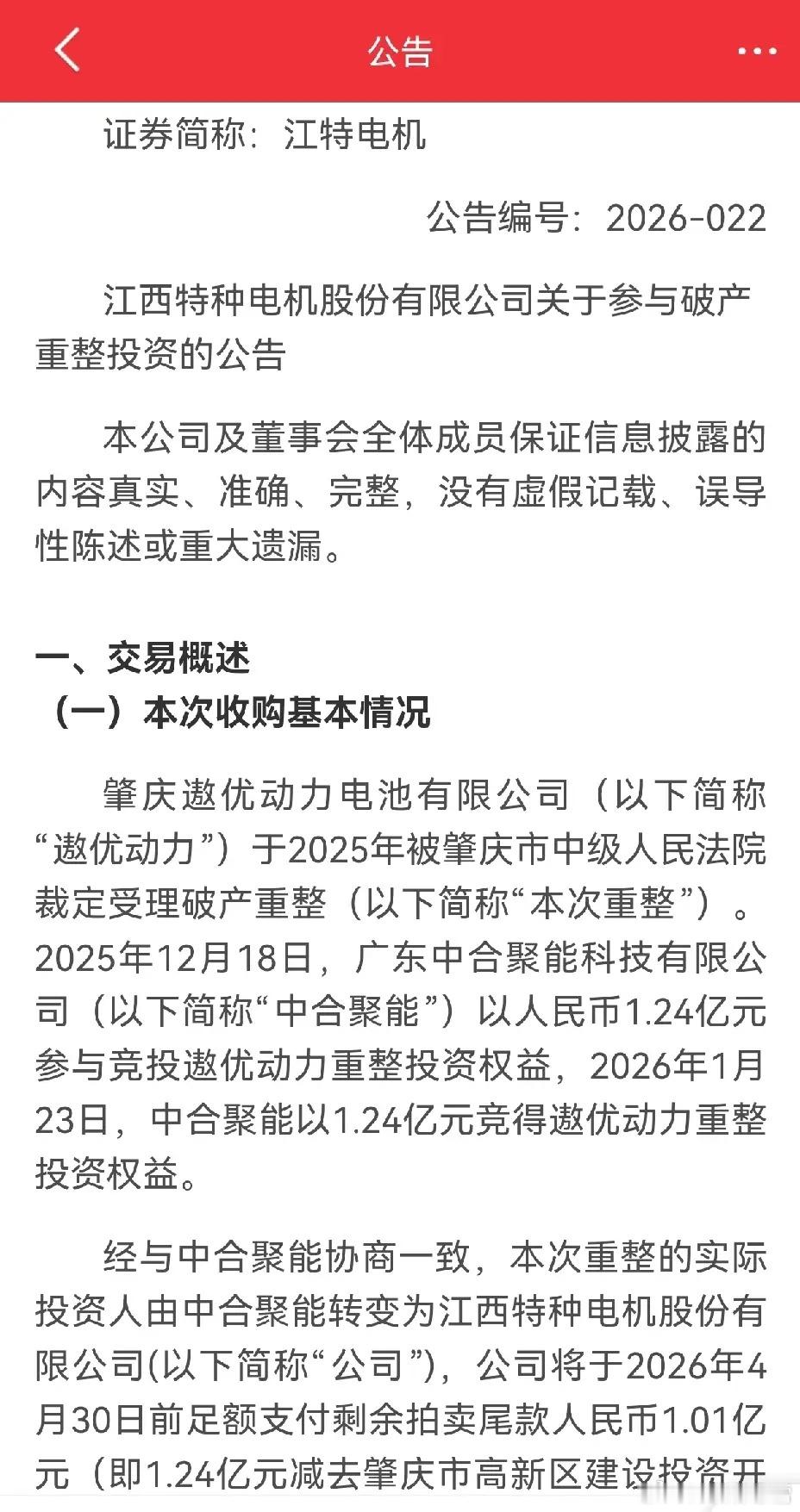 看到昨天有人问江特电机怎么样?我注意到了,公司参与破产电池公司重整,意欲收购该公司,有可能这一消息发酵,周五涨停。现在好多股票涨多了会回调,所以在其上涨并有了一定涨幅以后,要注意回调风险。