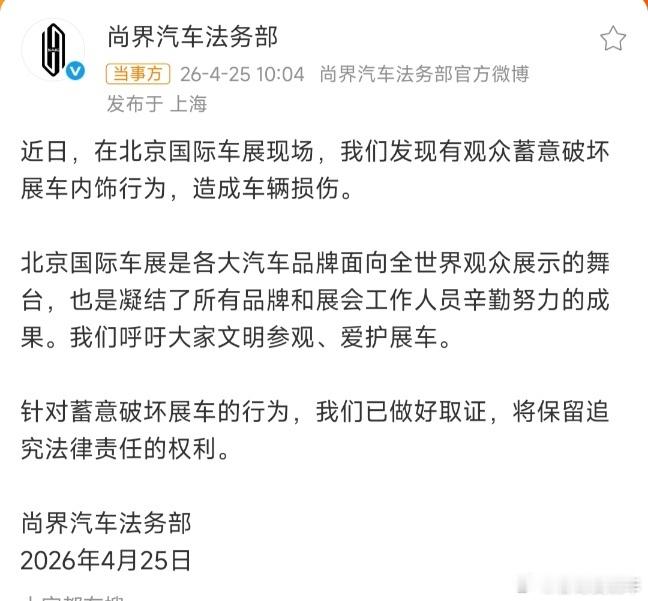 尚界回应有人蓄意破坏展车内饰造谣不成,还去北京车展线下破坏,这是有人指使还是极端