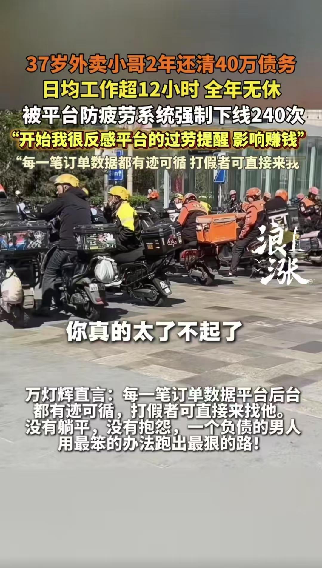 刚上大学,总觉得未来迷茫,直到刷到万灯辉的故事,一下子被治愈了。 他以前是火锅店老板,年入几十万,后来负债百万,却能放下身段跑外卖,一句抱怨没有,只是默默努力。他说“除了送外卖,我找不到月入3万的工作,必须拼”,这句话戳到我了。 美团也很给力,防疲劳机制强制12小时下线,两年里他被强制休息240次,还有近400场恳谈会、算法顾问委员会,实实在在守护骑手。原来平凡人只要肯拼,再难也能逆袭,这才是最真实的励志