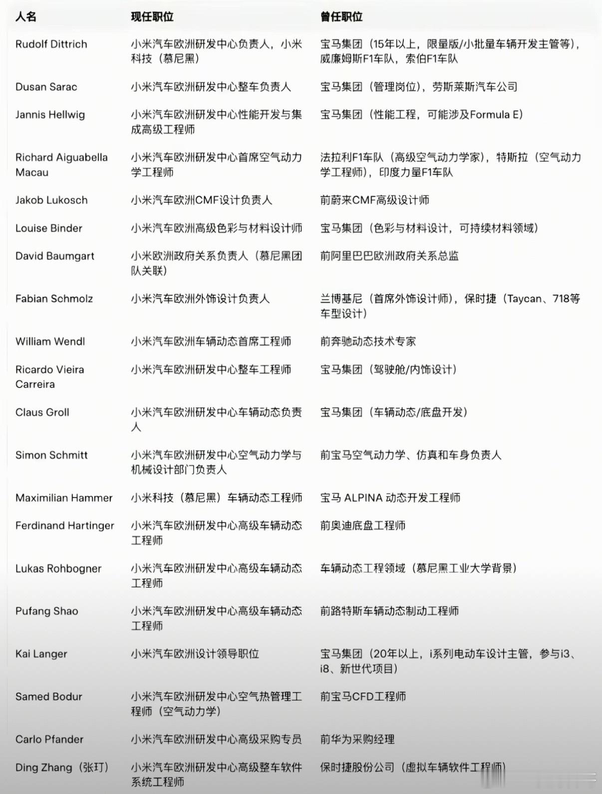 有网友扒拉出来小米汽车欧洲研发天团成员的履历了!整个宝马的核心团队几乎都搬过来了!宝马老总估计得气晕了!