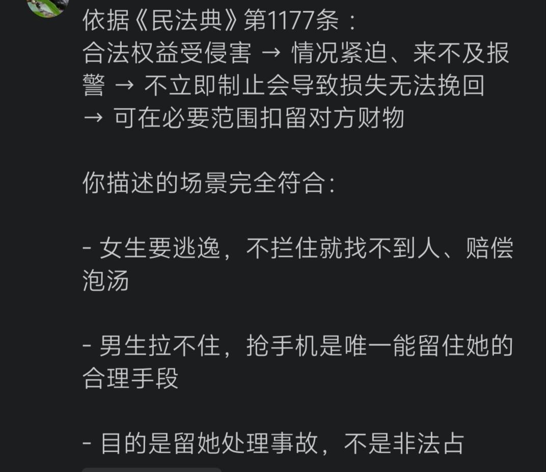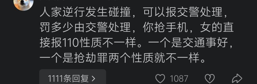 女子骑电动车逆行,撞到男子后态度强硬,并打算一跑了之。男子将她追回后,却因夺走女子两部手机的行为,让事情出现了不同看法。 近日,一女子骑电动车在非机动车道逆行时,不小心撞到了一辆正常行驶的电摩,导致电摩某个价值80元的部件损坏。 相撞后,骑电摩的男子话语中可能存在脏话,导致女子的情绪非常激动,站在他面前一直高声说着“骂呀、骂呀”。 此时本认为男子有点得理不饶人了,但是女子的下一个举动,让事情出现了反转。 就在男子因车子阻碍了交通,转身把电摩挪到路边时,女子竟然骑上电动车跑了,打算一跑了之! 看到女子骑着电动车跑了,男子迅速追了上去并很快将女子拦住。结果女子看到自己被追上了,把电动车往地上一扔,人又继续向前走去,此时男子只能用手将她拽住。 被男子拽住后,女子生气地甩开他的手,并且冒出一句:“别搁这讹人了!” 听到女子的话,男子的情绪也变得有些激动,反问她:“怎么叫我讹你?那个一块80块钱,你撞得我,不是我撞得你。你是不是在逆行?”男子一边说着,一边把打算离开的女子,又拽了回来。 见自己又被男子拽了回来,女子猛地将头盔摔在地上,并反称:“我在中间停的好好的,谁逆行谁知道。” 在被男子继续追问“你是不是逆行”后,女子竟然岔开自己是不是逆行的问题,反而高声喊着问男子:“你减速了没有,我就问你减速了没有?” 听到女子的反问,男子也生气了,对着女子高声喊道:“我减不减速,我是在顺行!”并第三次把打算离开的女子拽了回来说到:“好好说话啊,我是不是在顺行,你在逆行?” 镜头一转,两个人已经来到了男子的电摩前。 画面中,两人分别站在电摩两边,正在拉扯着争夺女子手中的两个手机,很快其中一个手机被男子夺了过去,并装进了口袋。 紧接着,男子绕过电摩朝女子快步走去,而女子一边后退一边高喊:“手机给我,把手机给我!” 随后男子上前拉扯女子,继续争夺她手里的另一个手机。过程中,女子一边反抗,一边喊着:“我(的)手机,有病吧你。” 不过女子的力量太小,被男子抓住手腕后,仅反复猛甩了一下,手机便到了男子手里。 看到第二个手机也被男子夺走,女子显得很生气,她猛地推倒男子的电摩,大声喊着:“手机给我!” 此时,男子一边把第二个手机装进口袋,一边去扶被女子推倒的电摩,口里同时说着“滚!你不赔付就是没有。” 扶起电摩后,男子一边收拾后备箱里掉出来的东西,一边继续追问女子:“你赔付不赔付,我就问你,你撞坏了我(的电摩)?首先有一点,我没有逆行对不对,是你在逆行。” 看到两个手机被男子夺走了,女子的表情也已经开始服软,对男子的称呼也变了,脸上略带无奈的想要解释。 结果女子“大哥”两个字刚说出口,男子便打断了她的活,表示:“我要是逆行了,我撞坏了你,我自然要赔你,对不对?我问你我是不是在顺行?我问你这个话啊!” 说着男子拿起一个被撞坏或摔坏的电摩配件,伸到女子面前让她看,并再次强调:“我在顺行,你在逆行!哥们,你看清楚。” 在男子一连串的问话时,女子彻底服软了,在男子说话时,只是小声的说了四五声“哥、哥”,但是每次叫完哥后,并没有继续再说什么。 看到男子骑上电摩,女子认为他是要走,急忙扶住男子说道“哥,咱讲理吧?我手机给我。” 怕男子骑电摩走了,女子一偏身,顺式坐到了男子的后座。 随后,男子拿出手机报了警,而女子则仍旧站在他旁边,偶尔说一句“把我手机给我。” 视频到这儿就结束了,至于事情的后续结果,暂时没有找到,应该已经调解解决了。 这件事,本身并不是什么大事。如果真是女子逆行,当时只要道个歉,并赔偿男子的损失就行了。 不过,由于当时女子一开始的时候,态度很强硬,拒不道歉,并且打算一跑了之。网上对她的评论,是一片的批评声。 但是男子在夺走女子两部手机后,评论区里也有了另一种不同的声音。 很多人认为,女子逆行不对,并且打算一跑了之的行为更不对,但是男子夺走女子手机后,性质就不一样了。女子逃逸可以报警,但是抢夺别人的手机,并且还是两部,有可能形成抢夺罪了。 也有人觉得,男子夺走女子手机的目的,只是想让她不要逃逸,并没有占为己有的意思,所以不能算抢夺罪。 不过,由于后续处理结果没找到,所以对男子夺走女子手机的行为,也不知道是怎么定性的。 其实,事情发生后,女子当时的态度好一点,道个歉,该赔偿的赔偿别人,事情应该不会弄成后面那样。 至于男子夺走别人的手机,只能说也是有些冲动了!幸好当时有不少路人围观见证,如果没有别人看到,或许一些事情就说不请了。