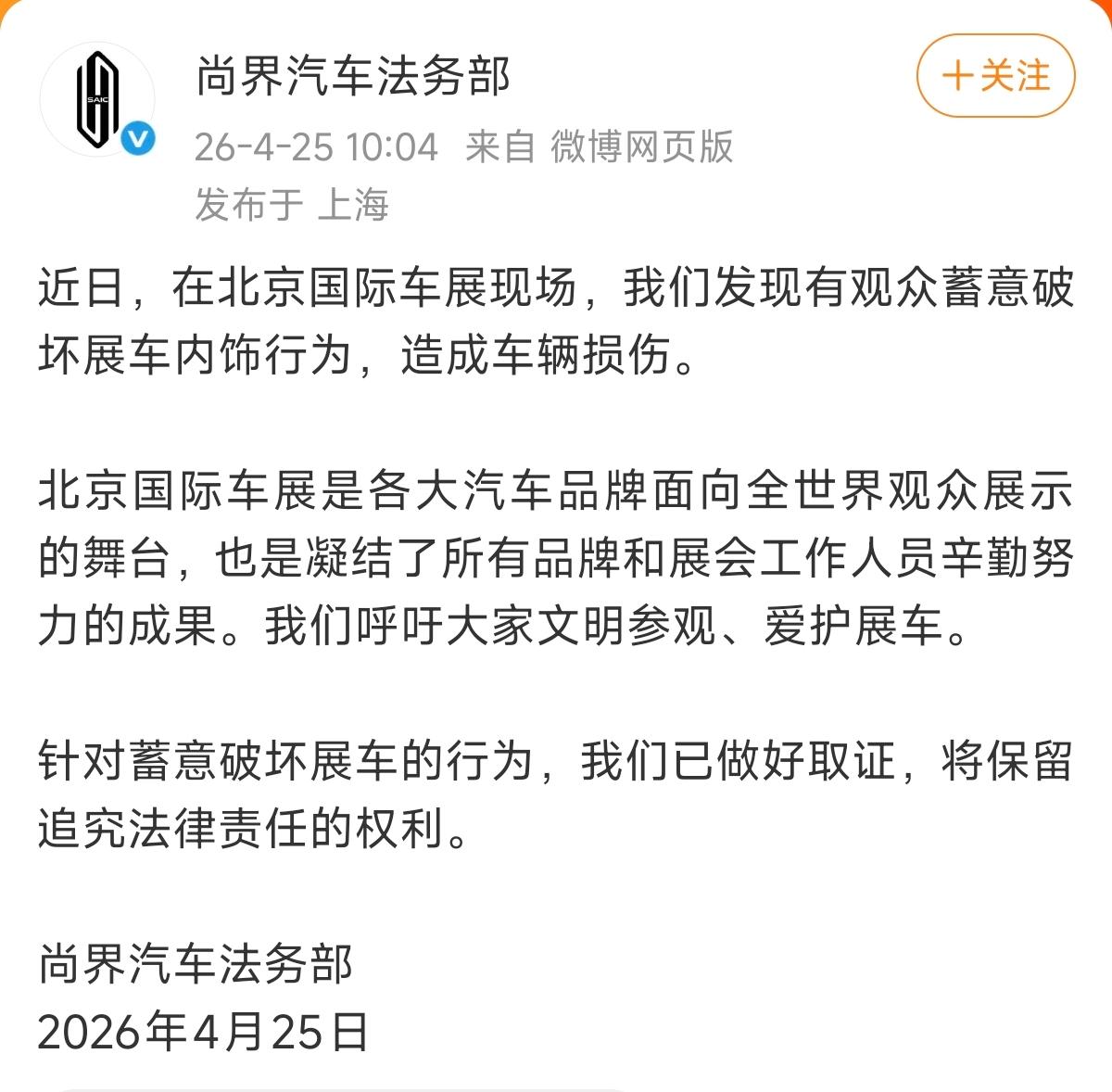 有人蓄意在北京车展上破坏尚界Z7展车内饰?尚界汽车发布严正声明:已做好取证,保留追求法律责任的权利!真不懂这些人咋想的,居然在大庭广众之下干这种缺德事儿!