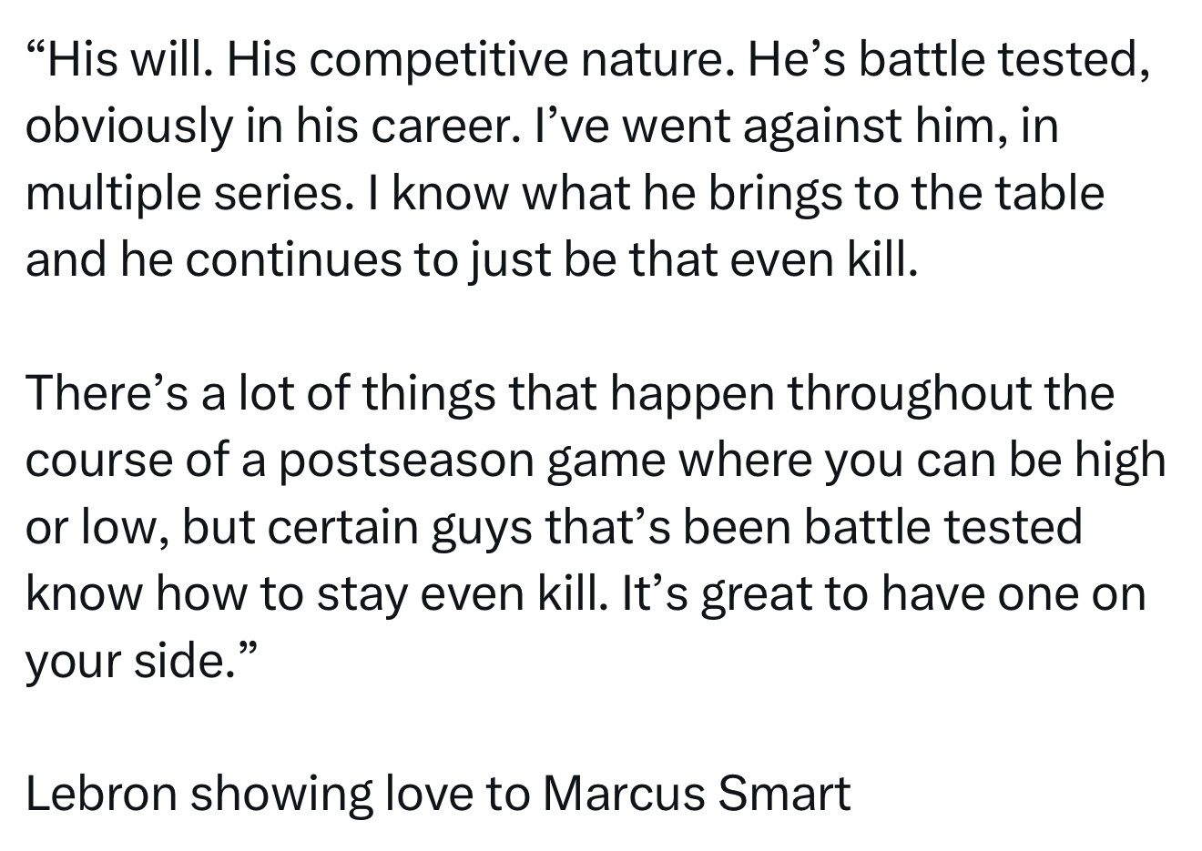在一场季后赛比赛中,会有很多让你情绪高低起伏的时刻,但某些经历过恶战考验的球员知道如何保持冷静、持续输出。能拥有这样一个队友在身边,感觉太棒了。”湖人3比0火箭