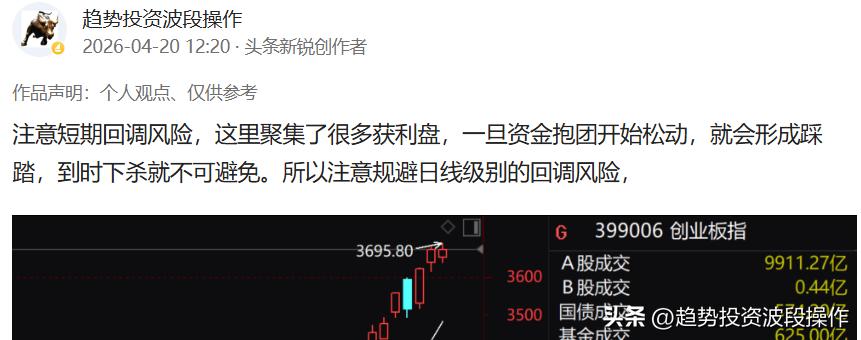 这周开始的回调,我觉得很多人都被跌蒙圈了吧,在20号的时候我就已经做出了提醒:日线级别的回调马上要来,要注意规避,去看看是不是这样的话,一但抱团松动,就是踩踏,看看新易盛代表的光模块,这就是妥妥的“光”抱团的筹码开始崩了。 所以说投资这事情千万别谈感情,赚了钱及时落袋才是上策,我估计这周很多人都冲进去了,去拥抱光了,因为到处都是相信光的信息,好像不占上光的话就损失一个亿似得。你相信真正赚钱的好事别人能告诉你吗,机构傻呀,它告诉你要涨了,让你去赚它的钱。你觉得可能吗? 一定要有逆向思维,当你看到市场很热,满屏皆是这个利好出行,一定要小心,因为利好往往就是别人想让你看到的,都是为别人打掩护的。反向操作就行,三根K线改变三观,你看着别人的股票涨,心里痒痒,追进去可能又是短期高点,再来三根阴线,你心态又崩了,赶紧割肉,可能就是短期买点。循环下去越亏越多。 日线级别的调整可能还要几天,五一假期之前还是要震荡的,等节后再说吧,赚钱不差这几天。学会忍耐,学会等待,千万别想着天天能赚钱,炒股就像手纸,90%都是用来护手的。