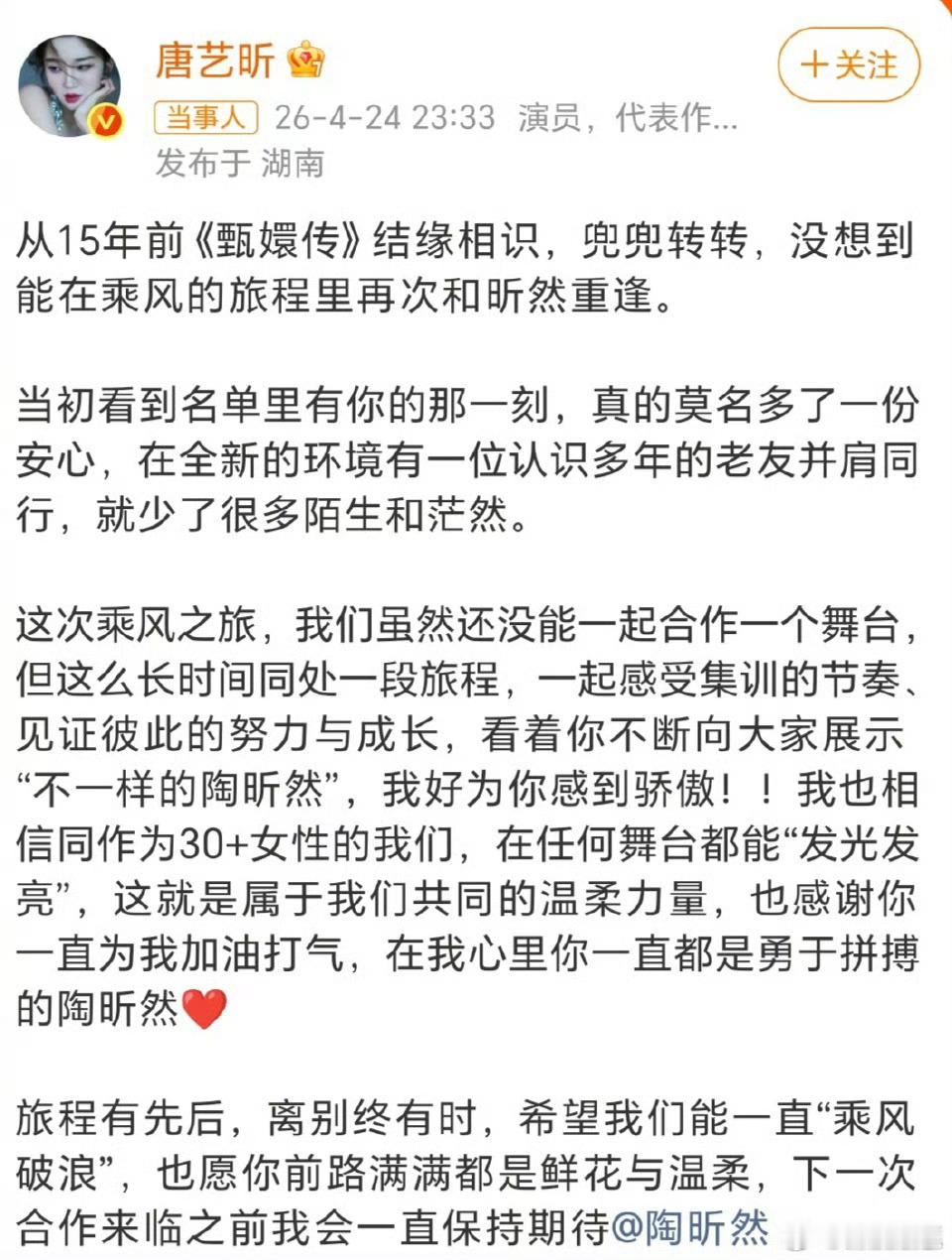 唐艺昕发文告别陶昕然 从《甄嬛传》的初遇到《乘风2026》的并肩同行,两位姐姐一路见证彼此的闪耀与成长,发文告别的瞬间满是真诚与不舍,这才是浪姐里最动人的神仙友谊,狠狠为这份双向奔赴的情谊感动,盼两位姐姐未来还能多多合作!乘风2026