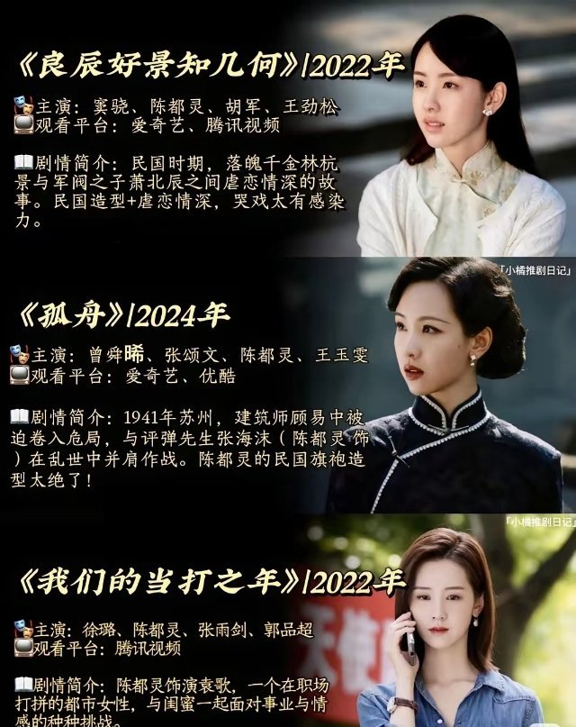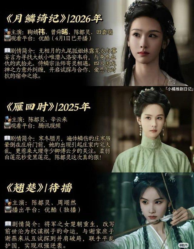 九尾狐姐姐又媚又狠,陈都灵这次直接美上热搜!顺势整理了她必看的9部剧,入坑的姐妹直接码住👇1. 《月鳞绮纪》 🔥正在热播陈都灵饰九尾狐雾妄言,面似春水、心有足谋2. 《雁回时》 🏆黑莲花庄寒雁柔弱外表步步为刃,复仇爽剧3. 《翘楚》 🌟待播权谋大女主陈都灵饰楚朝,重生逆天改命,优酷预约破50万4. 《良辰好景知几何》 🏆民国虐恋落魄千金林杭景,哭戏绝了5. 《孤舟》 🏆谍战旗袍封神评弹先生张海沫,乱世并肩6. 《我们的当打之年》 🏆都市职场袁歌,姐妹互相扶持7. 《大梦归离》 🏆古装奇幻缉妖司文潇,温柔勇敢8. 《长月烬明》 🏆“欢姐杀疯了”一人分饰三角,天欢狠辣出圈9. 《莲花楼》 🏆白月光乔婉娩李相夷的初恋,清冷温婉《月鳞绮纪》的雾妄言你追了吗?陈都灵哪个角色是你心中的TOP1?我先来——天欢!欢姐杀疯了! 😭
