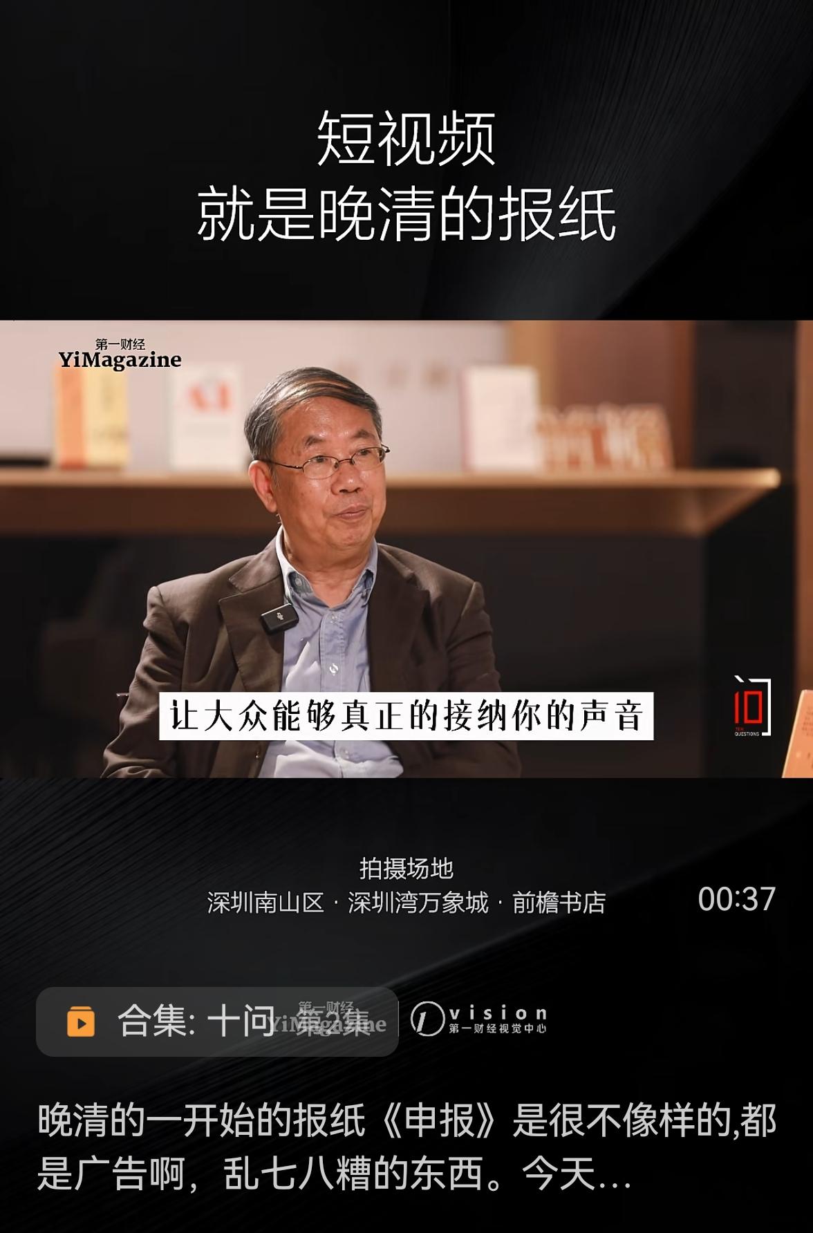 “晚清的一开始的报纸《申报》是很不像样的,都是广告啊,乱七八糟的东西。今天的短视频,可能就是晚清的报纸。晚清报纸刚出来,也被大家骂。可是有一批有识之士投进去,他就能改进它,能改变它,逐渐逐渐就会出好的东西。” 作为短视频的重度消费者轻度创作者,我只有一个看法,就是,陈平原老师太想当然了,一厢情愿了。