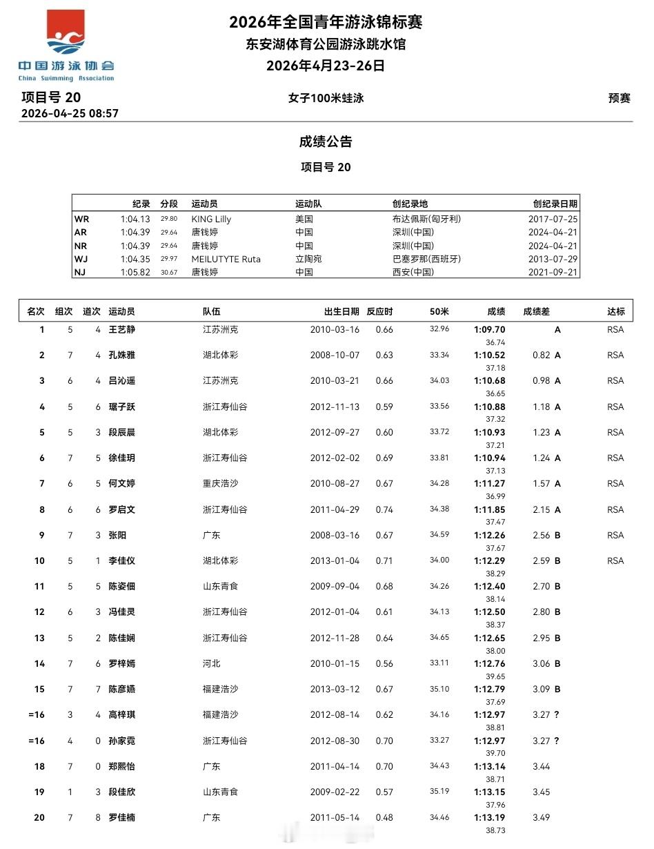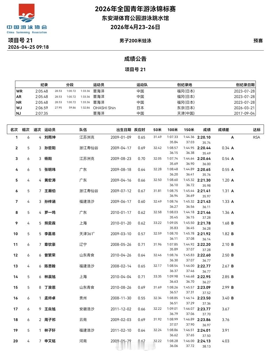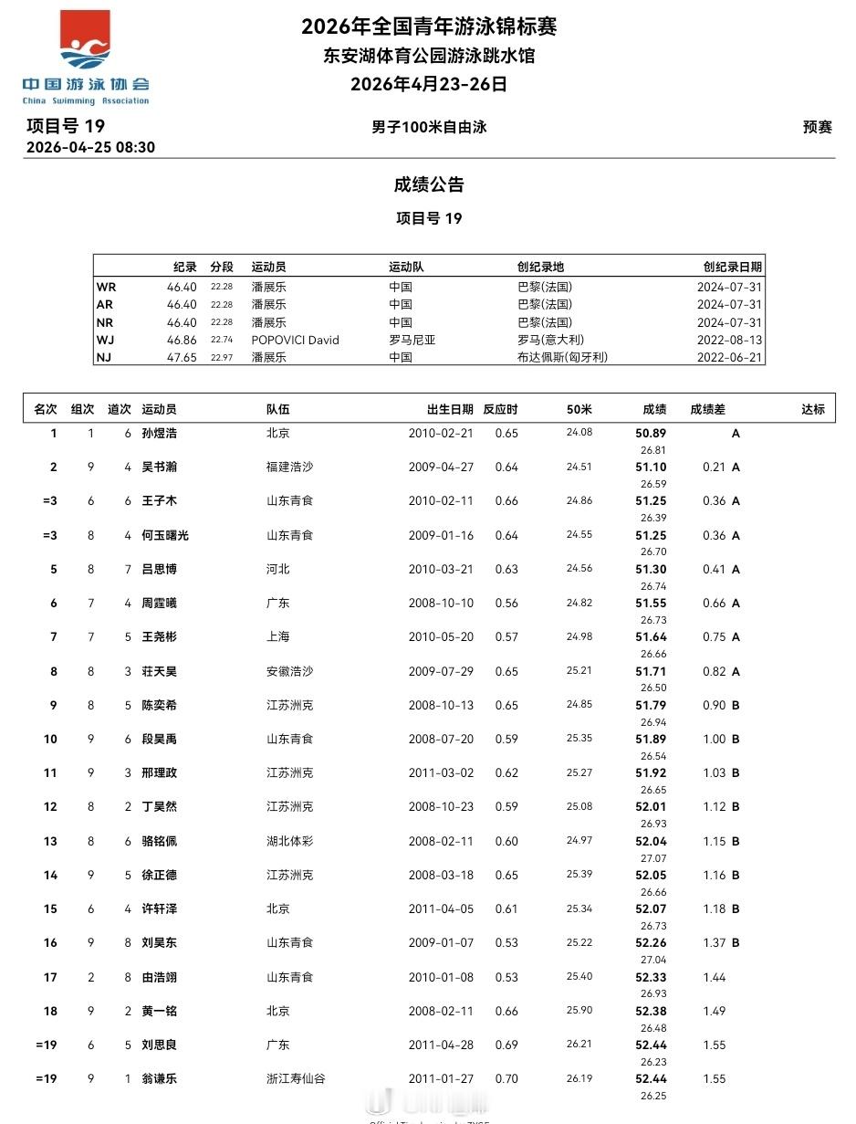全国青年游泳锦标赛 第三天预赛男100自:孙煜浩 50.89女100蛙:王艺静 1:09.70男200蛙:刘雨坤 2:20.10女400混:柯雯曦 4:46.60男100蝶:林宇宸 53.57女100蝶:龚真琦 58.93男400自:李城宇 3:55.70
