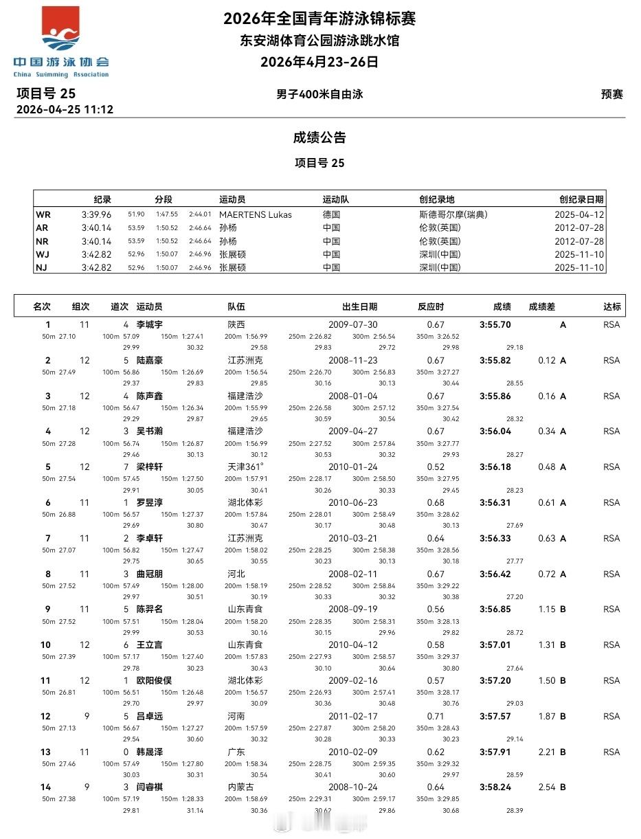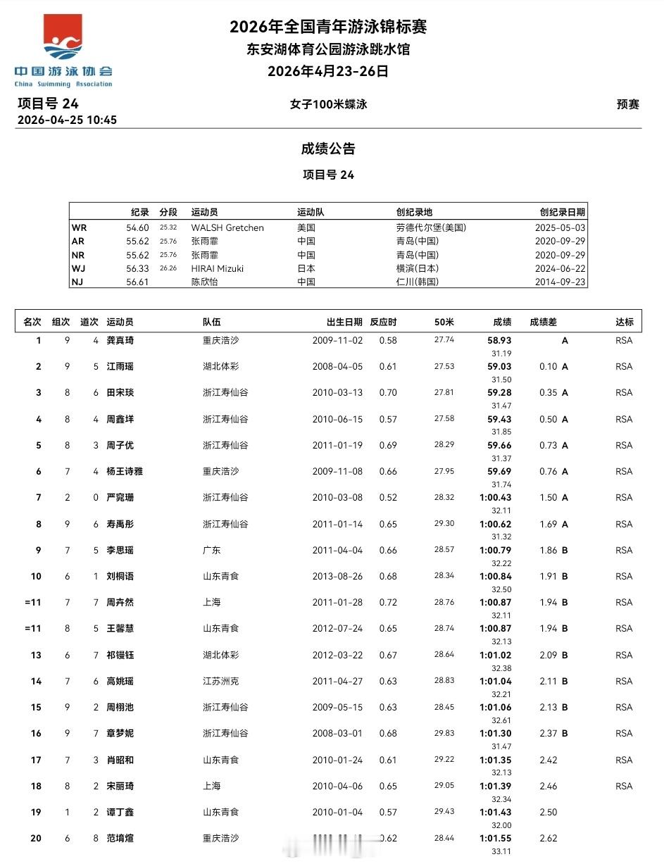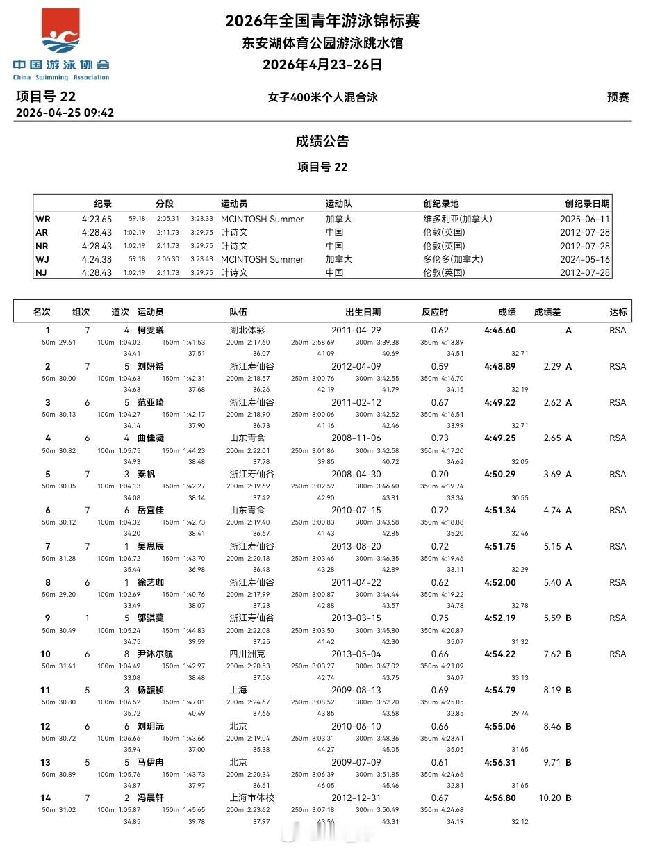 全国青年游泳锦标赛 第三天预赛男100自:孙煜浩 50.89女100蛙:王艺静 1:09.70男200蛙:刘雨坤 2:20.10女400混:柯雯曦 4:46.60男100蝶:林宇宸 53.57女100蝶:龚真琦 58.93男400自:李城宇 3:55.70