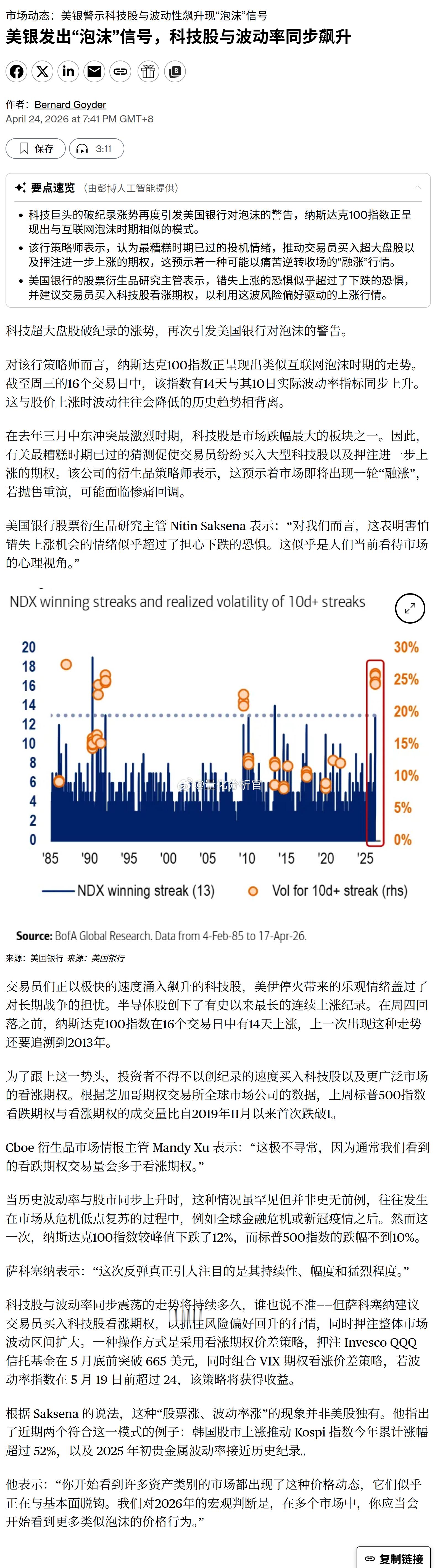 我们生活在一个越来越极端的世界中——美银:“股票大涨、波动率大涨”的极端大涨现象往往预示着历史上的“泡沫”信号,韩国股市仅4个月的指数Kospi 涨幅就超过了52%,去年2025年初贵金属的波动率也创近100年的历史纪录,当下的美股,连涨18个交易日,都创造了几十年来的记录。