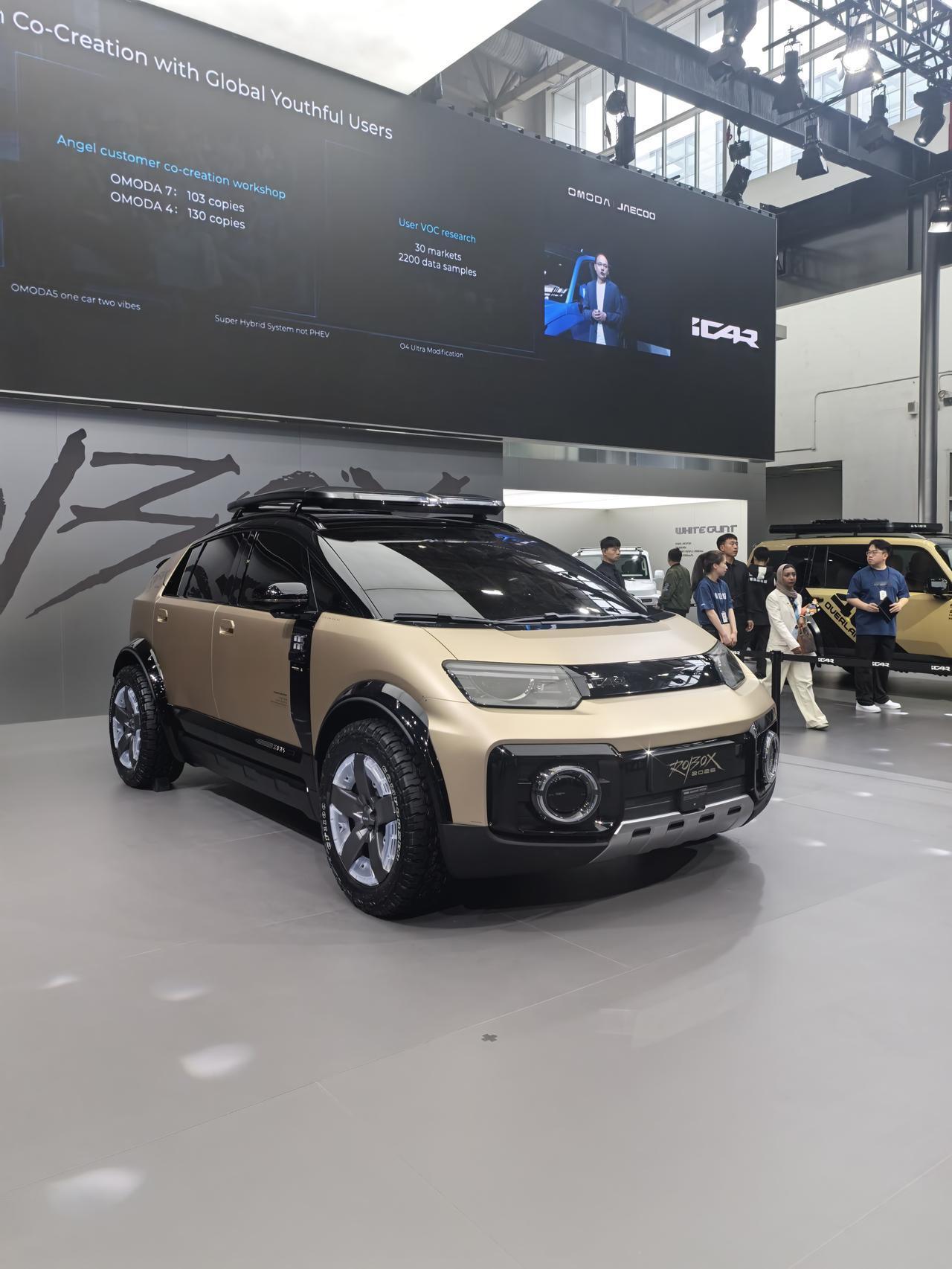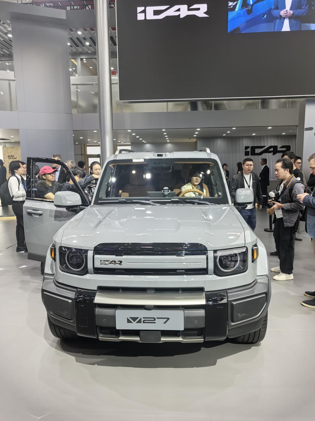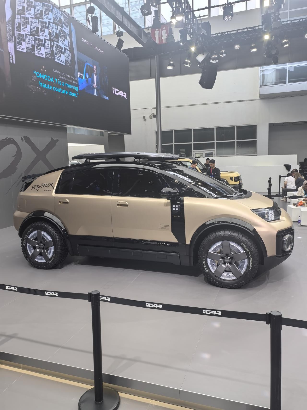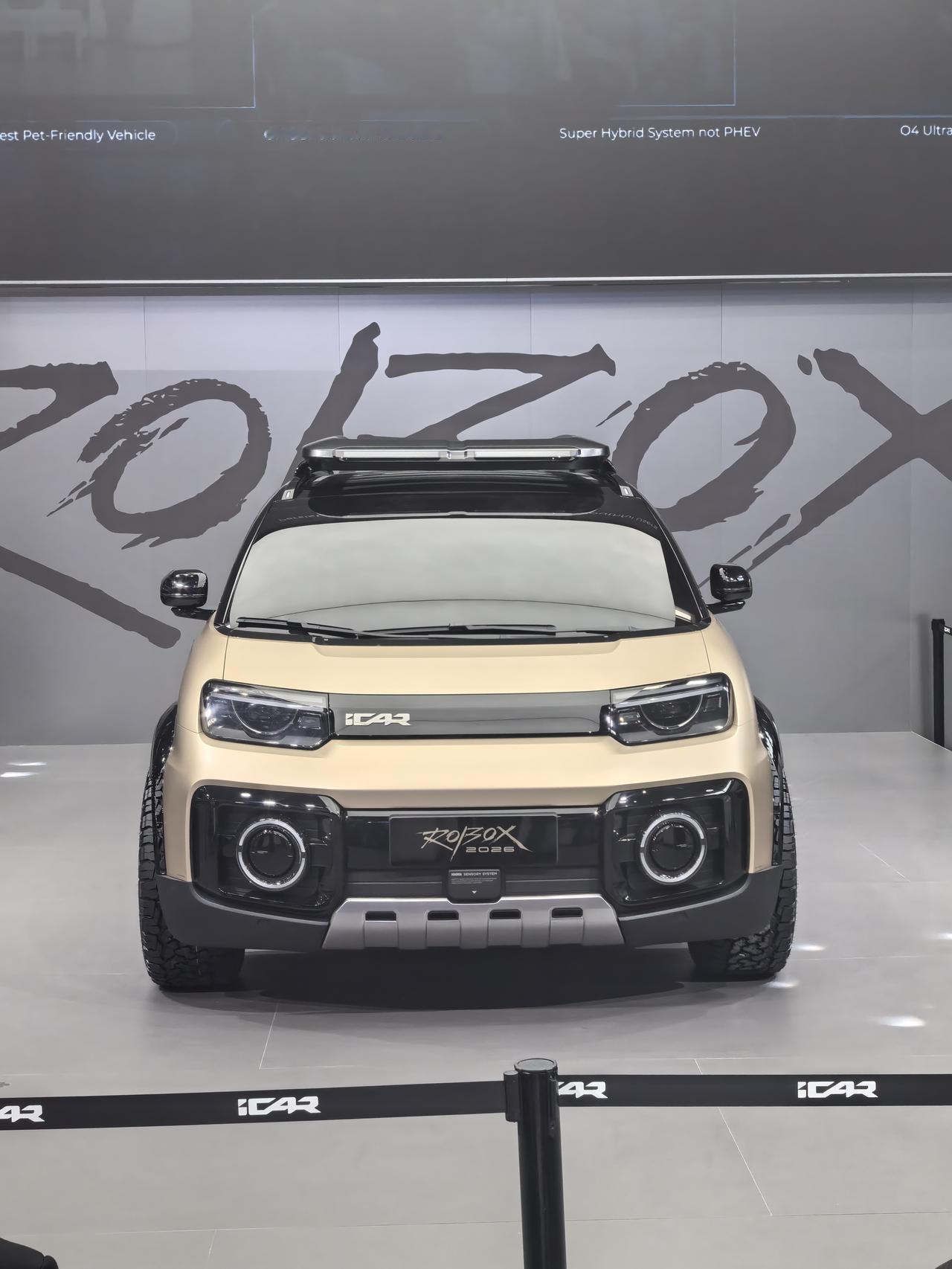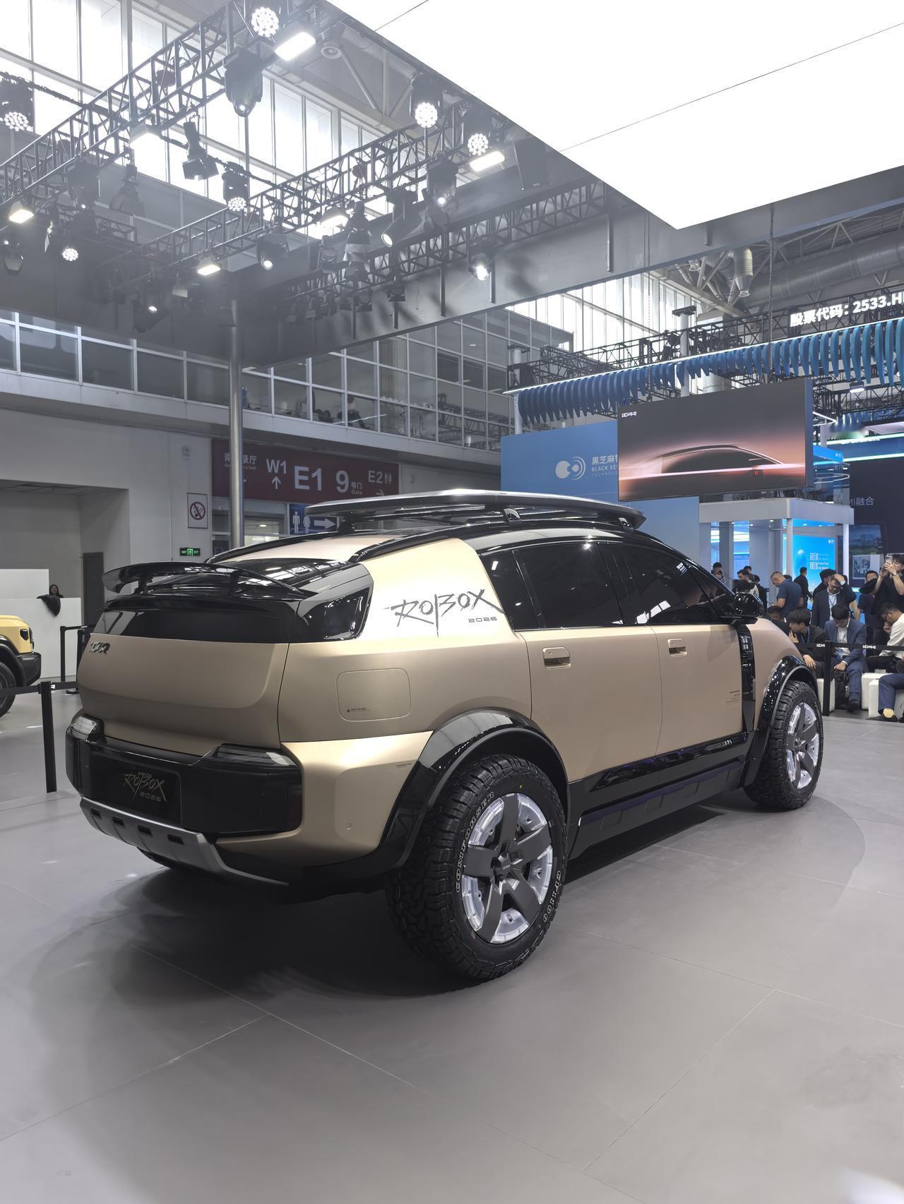 再给你说说iCAR这次在北京车展的亮眼表现!他们带来了好几款重磅车型:首先是ROBOX概念车全球首秀,还有ROBOB新能源摩托车,以及V23和V27家族一起亮相。 重点说说这台全球首秀的ROBOX概念车。名字很有意思,是“ROBOT(机器人)”和“BOX(盒子)”的组合,它是iCAR全新X序列第一款产品的概念版本。外观设计上玩得很极致:车头的圆形和矩形灯组是上下分开的;腰线以下则是高高离地间隙、超大轮毂和宽体轮眉。整个车身型面非常简洁,同时还保留了科技岛、C柱盲窗、乐高式高位刹车灯这些家族经典元素,辨识度超高。总之就是又酷又有个性!【来自懂车帝车友圈】