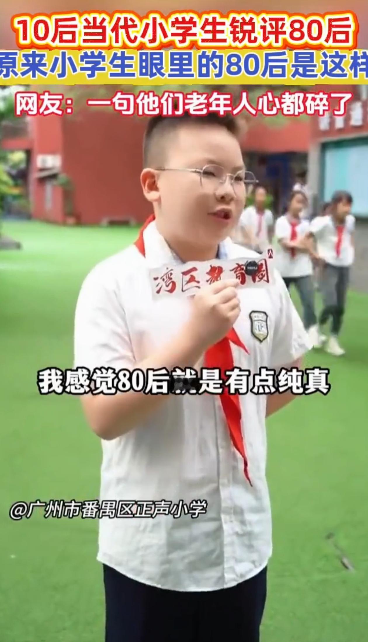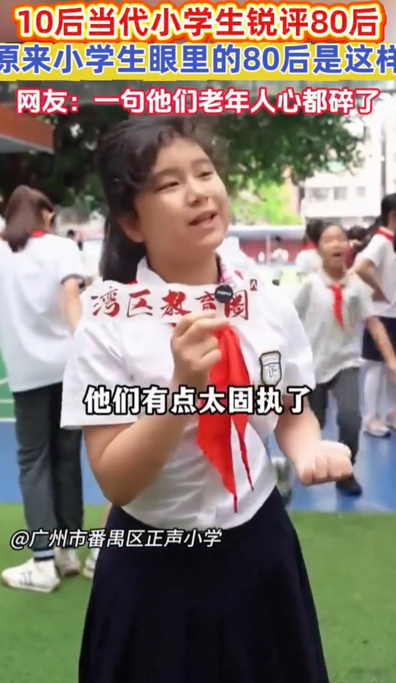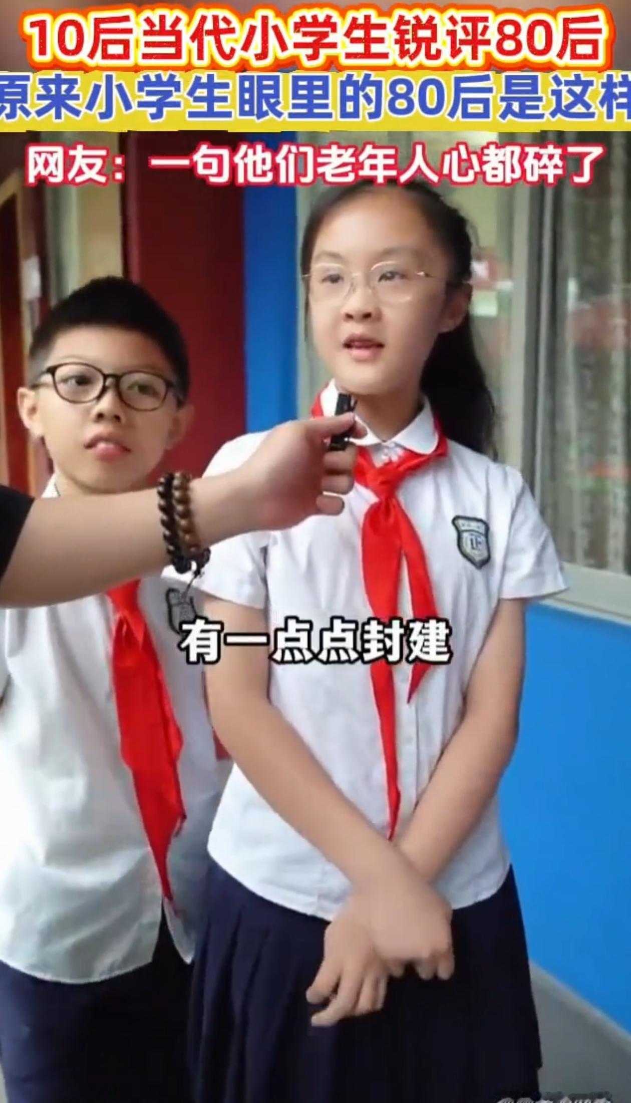 “破防了!”广东广州,记者去小学采访10后的小学生,想问问他们怎么看待80后,谁成想小学生上来就毫不留情,直言80后太封建,太固执! 小学生为什么会有这样的想法呢?其实很大概率跟她们的家长有关系,比如有一位小朋友就提到,他的家长就老是跟他说:“我当年要是有这个条件,早就上清华北大啦”,又或者“我当年都是自己做早饭的”! 而且吧,80后还有点“固执”,因为现在很多新生的概念,孩子跟他们说了,他们觉得理解不了,怎么会是这样的? 不过10后也有夸奖80后的,比如这位小朋友就觉得80后很勤劳,为什么呢?因为80后小时候都要耕田哈哈哈哈,也有小学生觉得80后很纯真,这也算是夸奖吧! 看到10后小学生对80后的锐评,有80后网友调侃自己都是老古董了,快被时代抛弃了,也有网友感慨,转眼10后都上小学了,自己真的老了。 其实80后真的挺不容易的,这个年纪的80后,大多都是上有老下有小,自己夹在中间,一门心思都扑在了家上,了解这个世界的时间自然就少了,所以很多当下的流行梗他们不懂,也不能怪他们。 当然啦,小学生可不会估计什么客套。在孩子的世界里,有话就要直说,所以他们的锐评看似扎心,实际上却带着孩子的天真浪漫,相信80后也不会真的跟他们生气的对不对? 你觉得10后对80后的评价对不对?