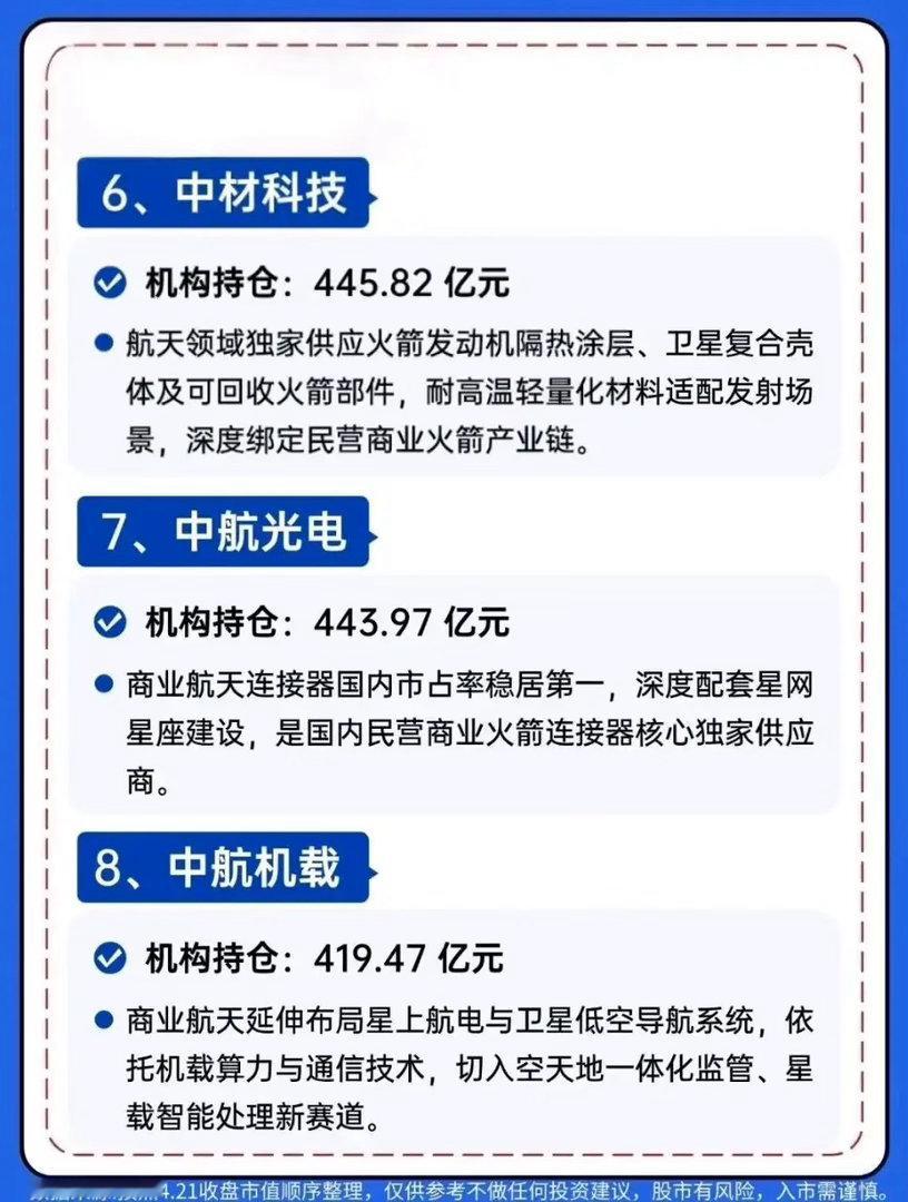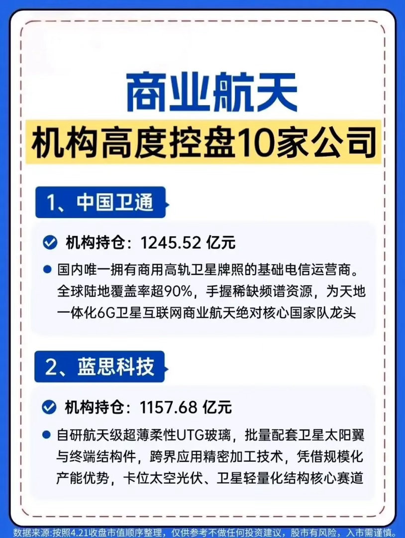商业航天赛道爆发!机构高度控盘的10家龙头企业名单曝光了,从卫星制造、核心配套到数据服务全产业链覆盖,快来看看有没有您的持仓?中国卫通:机构持仓1245.52亿,国内唯一拥有商用高轨卫星牌照的基础电信运营商。