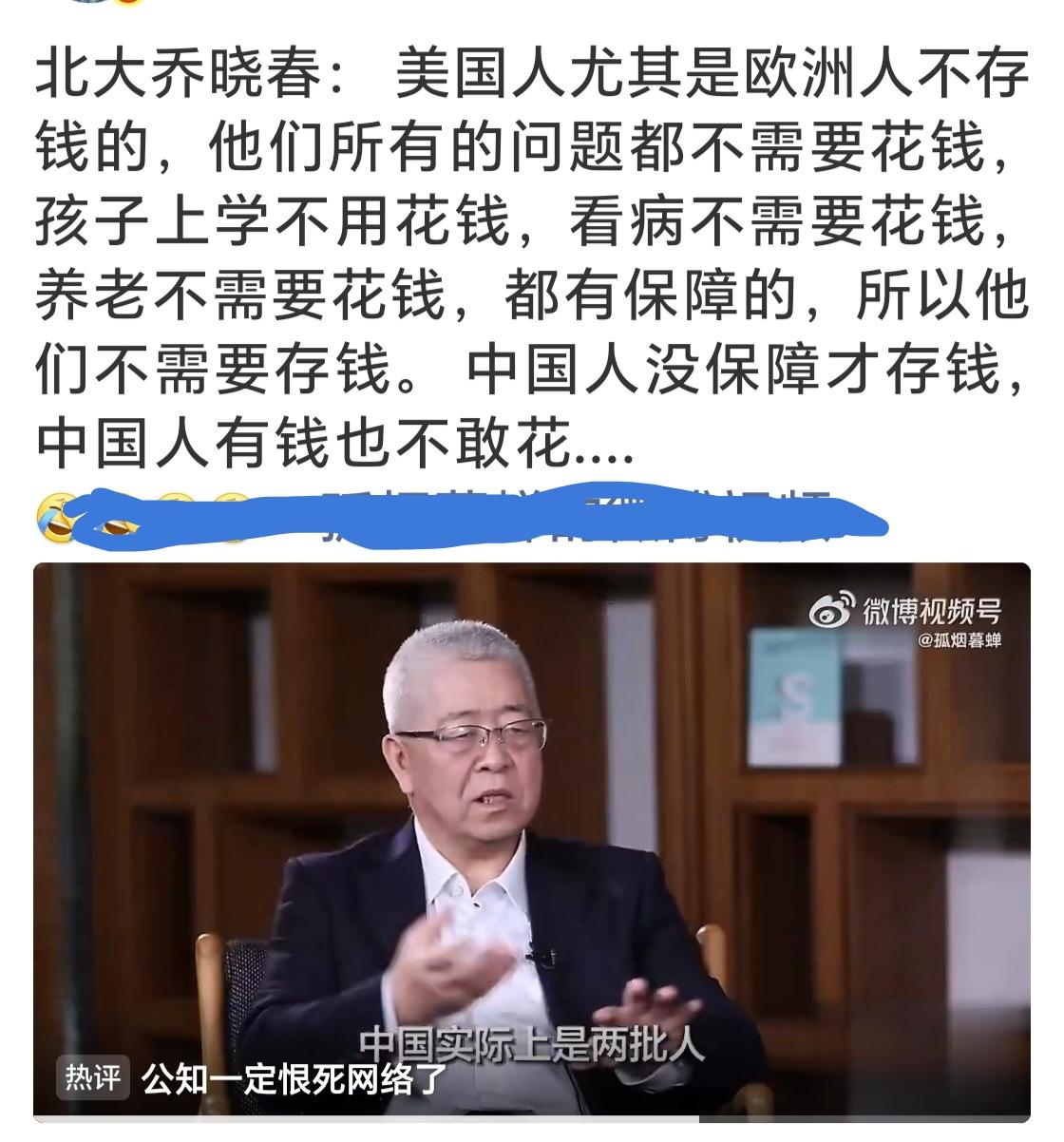 北大教授乔晓春说: “美国人尤其是欧洲人不存钱的,他们所有的问题都不需要花钱,孩子上学不用花钱,看病不需要花钱,养老不需要花钱,都有保障的,所以他们不需要存钱。 中国人没保障才存钱,中国人有钱也不敢花.... ” 乔晓春这段话受到了很多人的批评。现在中国人和美国、欧洲的交往比较多了,很多人都了解美国和欧洲的情况,不好忽悠了。 乔晓春说的也不完全错,他对欧美的认知还停留在几十年前。世界变了,中国变了,乔晓春对欧美的印象没有变。乔晓春并不真正了解美国和欧洲,尤其是不了解现在的美国和欧洲。他也不了解现在的中国,虽然他生活在中国。 美国和欧洲也不一样。在美国如果没有工作,没有钱 ,寸步难行。某些欧洲国家的社会福利比美国好一些。用于社会福利的钱来自企业和个人交的税,不是天上掉下来的。福利好,税率必然高。这样企业就缺乏竞争力。乔晓春作为研究人口的经济学教授,竟然连这些常识都不懂。