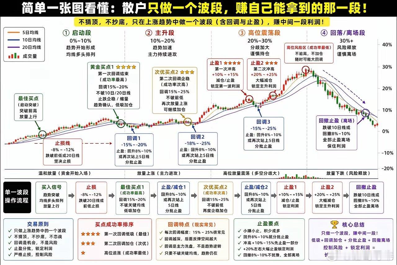 【一张图看懂:散户只做一个波段,怎么一步一步赚钱?】很多人做股票最大的问题只有一个:👉 想买最低,卖最高。A股平均一个波段15-25%左右,每次波段能把这都拿到吗,能拿到10%-15%左右已经很厉害?但现实是——你做不到,也不需要做到。---一、先记住核心原则(一定要配合图看)✔ 只做上涨趋势(5/10/20日线向上)✔ 只做一个波段(不恋战)✔ 只赚中间那一段利润👉 下面每一步,都在图中有对应位置---🟢 ① 启动段(图最左:买点)当你看到:- 5日、10日、20日线开始上扬- 股价站上均线👉 操作:✔ 买入30%仓位(试仓)👉 止损:✔ -8%~-12% 或跌破20日线👉 重点:这里只是上车,不是重仓点---🟡 ② 第一次回调(图中“黄金买点1 ⭐⭐⭐⭐”)👉 整张图最重要的位置!当你看到:- 回调15%~20%- 不破10/20日线- 出现止跌👉 操作:✔ 加仓到60%~70%👉 重点:成功率最高的买点(一定要找这个位置)---🔵 ③ 第一次冲高(图中“止盈1 +10%~15%”)👉 操作:✔ 卖出30%~50%👉 重点:先把最容易赚的钱拿走---🟡 ④ 第二次回调(图中“次优买点2 ⭐⭐⭐”)👉 条件:- 回调15%~25%- 不破前低👉 操作:✔ 小幅加仓👉 重点:还能赚,但风险开始变大---🔵 ⑤ 第二次冲高(图中“止盈2 +20%~25%”)👉 操作:✔ 再卖30%~50%👉 重点:锁住主升浪利润---🟠 ⑥ 高位震荡(图中“高位风险区”)👉 操作:❌ 不加仓✔ 只减仓👉 重点:这里看起来最强,其实成功率最低---🔴 ⑦ 回撤止盈(图最右:离场点)👉 条件:- 跌破10日线- 或回撤8%~10%👉 操作:✔ 全部卖出👉 重点:不把利润还给市场---📌 整张图总结👉回调(左侧)→ 加仓冲高(中段)→ 减仓高位(右侧)→ 不参与---🎯 最后一句(一定要记住)👉真正该赚的钱,不是最低和最高,而是趋势中间那一段。(个人观点,不构成投资意见)
