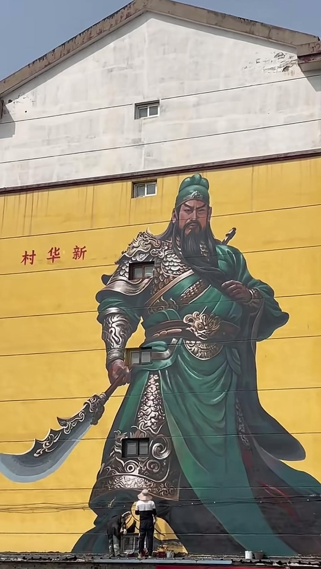 新华村这尊关公墙绘,还是很有水平的,女画家画了整整四天! 书记表示,想打卡的网友抓紧时间吧,可能要“下架”! 视频里也没说原因。 印象中的关公像都是在庙里,要不怎么会有关公庙呢! 可能是不想关二爷风吹日晒吧! 关公墙绘 新华村