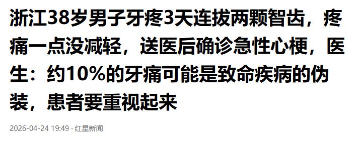 4月24日,浙江38岁男子牙疼3天连拔两颗智齿,疼痛一点没减轻,送医后确诊急性心梗,医生:约10%的牙痛可能是致命疾病的伪装,患者要重视起来。 浙江一家医院的急诊抢救室里,38岁男子躺在病床上,胸口剧烈起伏,脸色惨白如纸,浑身被冷汗浸透,呼吸微弱。医生拿着检查报告,神色凝重,谁也没想到,这个因牙疼连拔两颗智齿的男子,最终被确诊为急性心梗,险些丧命。 没人能想到,一场看似普通的牙疼,竟然藏着致命危机。38岁男子此前牙疼得厉害,连续疼了3天,吃了止痛药也不管用,整夜整夜睡不着觉,脸颊也跟着肿胀,连吃饭、说话都受到影响。 男子实在忍受不了牙疼的折磨,便找了一家牙科诊所,想着把引发疼痛的智齿拔掉,就能彻底缓解痛苦。经过简单检查,医生判断他的牙疼是智齿发炎引起的,便建议他拔掉智齿,男子没有犹豫,当即同意。 拔牙过程很顺利,男子先后拔掉了两颗智齿,还遵医嘱服用了消炎药和止痛药,本以为拔掉智齿后,牙疼就能彻底消失,可他万万没有想到,疼痛不仅没有减轻,反而变得更加剧烈,连带着胸口也开始发闷。 拔掉智齿的当天下午,男子的牙疼依旧没有缓解,反而越来越严重,胸口的闷痛感也在不断加剧,浑身无力,连站起来的力气都没有,额头不停冒冷汗,脸色也变得越来越差,家人见状,吓得赶紧扶着他赶往医院。 一路上,男子疼得浑身发抖,胸口像是被一块巨石压住,呼吸困难,连说话都断断续续,家人急得满头大汗,不停催促司机加快速度,生怕晚一步就出大事,心里满是焦急和慌乱。 到达医院后,医生立刻对男子进行全面检查,测量血压、做心电图、抽血化验,一系列检查下来,医生很快给出了诊断结果——急性心梗,而且他的右冠脉血管狭窄程度已经达到90%以上,情况十分危急。 医生当即对男子进行紧急抢救,植入支架疏通堵塞的血管,经过几个小时的全力救治,男子的病情终于得到控制,脱离了生命危险。直到这时,家人才松了一口气,也终于明白,男子的牙疼,根本不是智齿引起的。 医生在后续问诊中表示,男子的牙疼,其实是急性心梗引发的牵涉痛,心脏和下颌区域共用同一段神经线路,心肌缺血时,大脑会认错疼痛位置,让人误以为是牙疼,这也是他拔了智齿疼痛仍未缓解的原因。 更让人揪心的是,医生透露,约10%的牙痛,都可能是致命疾病的伪装,除了急性心梗,主动脉夹层、三叉神经痛等疾病,也可能伪装成牙疼,很容易被误诊,耽误最佳治疗时机。 医生介绍,心源性牙痛和普通牙疼有明显区别,这类牙痛多发生在左下颌,疼痛部位不固定,可能游走,还会伴有胸闷、大汗淋漓、左肩或后背放射痛,休息后也难以缓解,且口腔检查找不到明显问题。 男子清醒后,得知自己的病情,满脸震惊和后怕,他坦言,自己从来没有想过,牙疼竟然会和心梗有关,以为只是普通的智齿问题,若不是家人及时送医,自己恐怕已经丧命,想想都让人不寒而栗。 他回忆,牙疼的这3天,除了牙齿疼痛,其实还出现过轻微的胸闷症状,只是当时一门心思放在牙疼上,没有在意,以为是休息不好导致的,现在想来,那些都是心梗发出的预警信号,只是被自己忽略了。 男子的经历,给所有忽视牙疼的人敲响了一记警钟,牙疼不是小事,尤其是不明原因、难以缓解的牙疼,一定要重视起来,及时排查隐患,才能避免悲剧发生。 对此,你们有什么看法,欢迎评论留言~